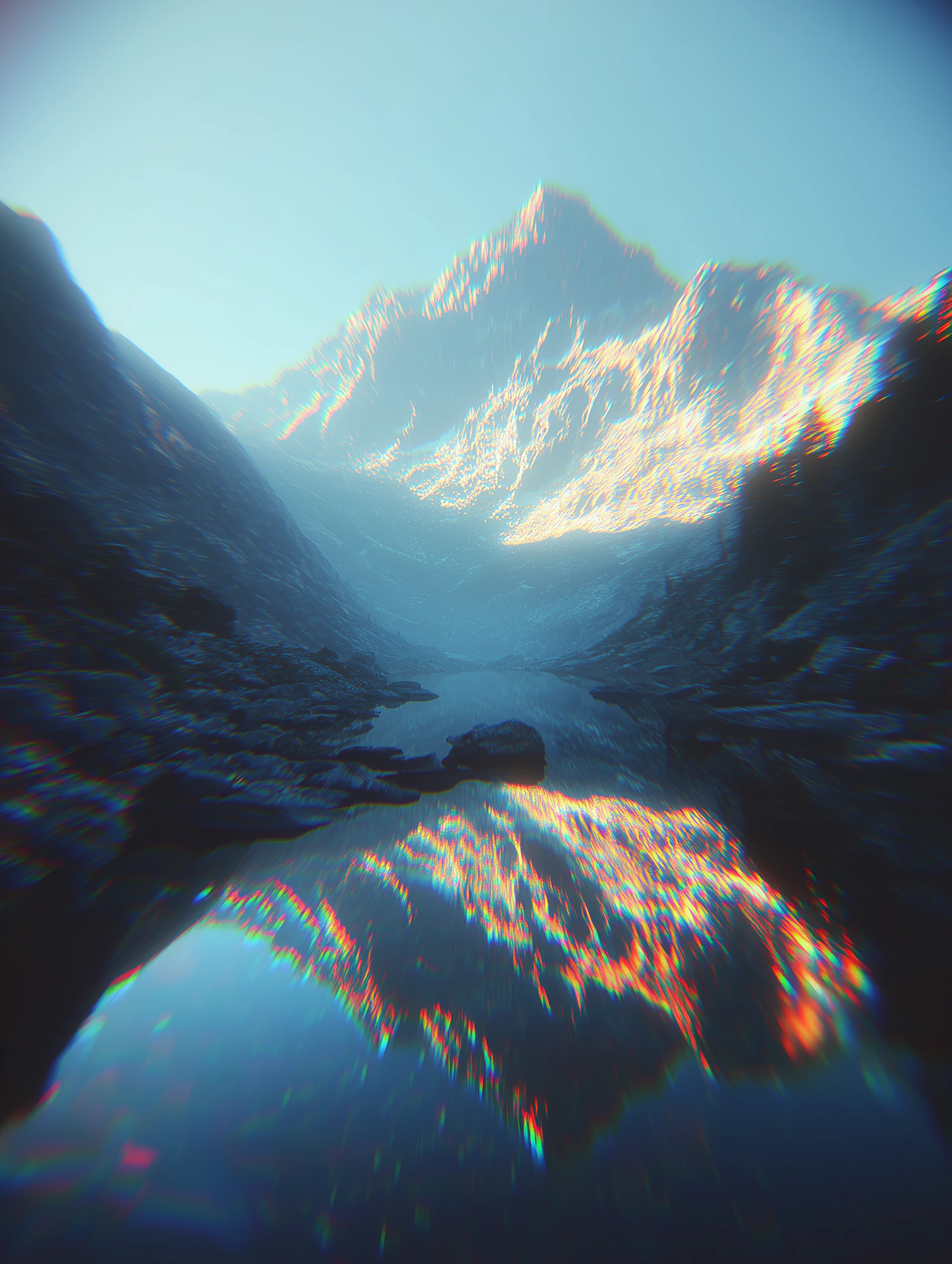 A stunning mountain scene with a reflective lake, glowing peaks, and a surreal chromatic effect creating a dreamlike atmosphere.