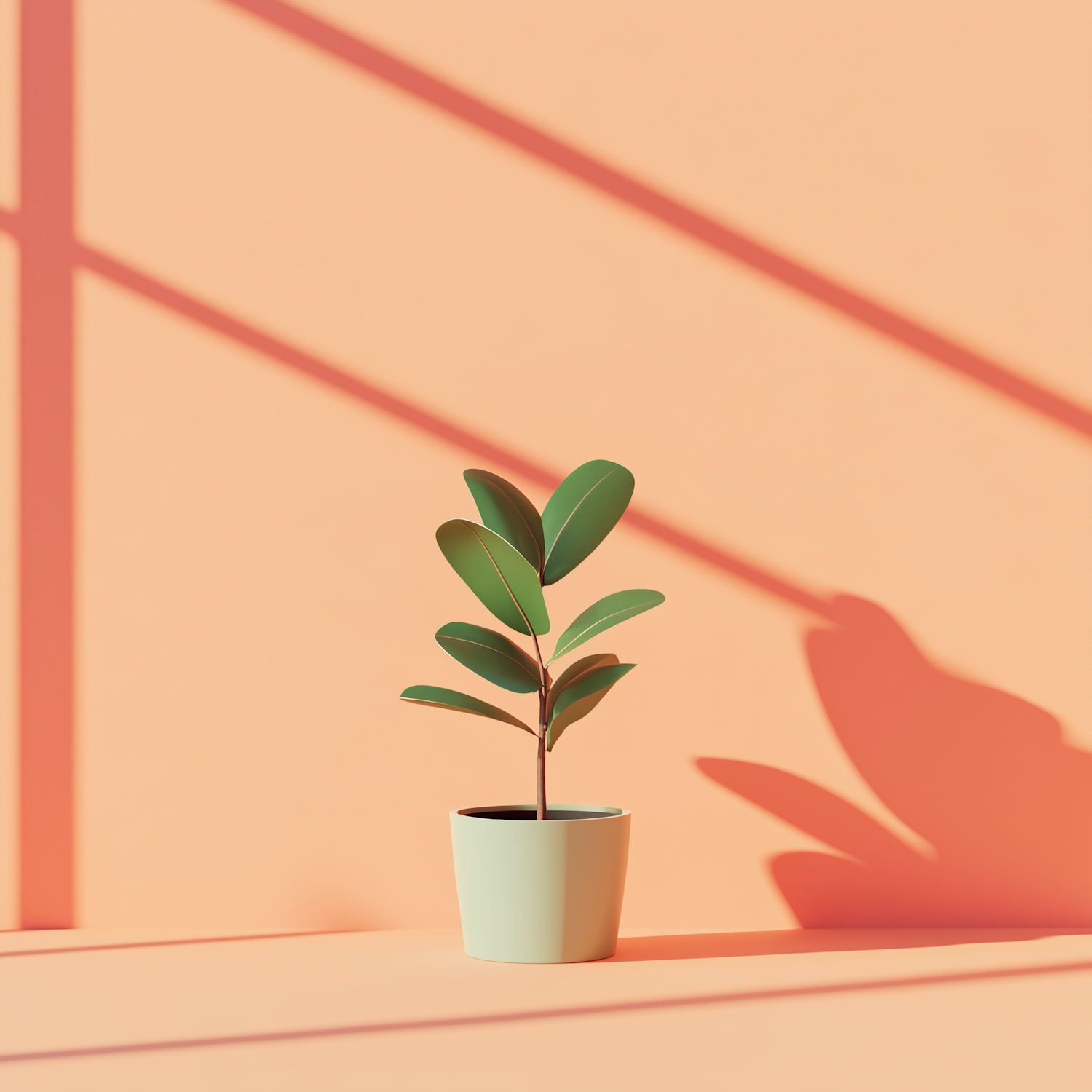 Minimalist potted plant against a peach wall with striking shadows, creating a serene and modern aesthetic.
