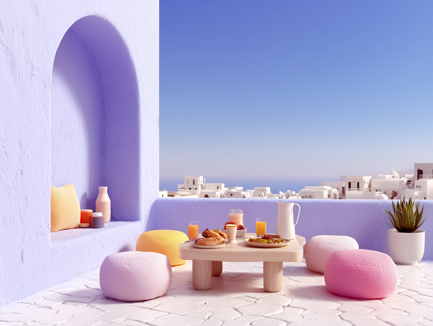 A pastel-themed terrace with a breakfast setup, soft cushions, and a view of whitewashed buildings against a clear blue sky.