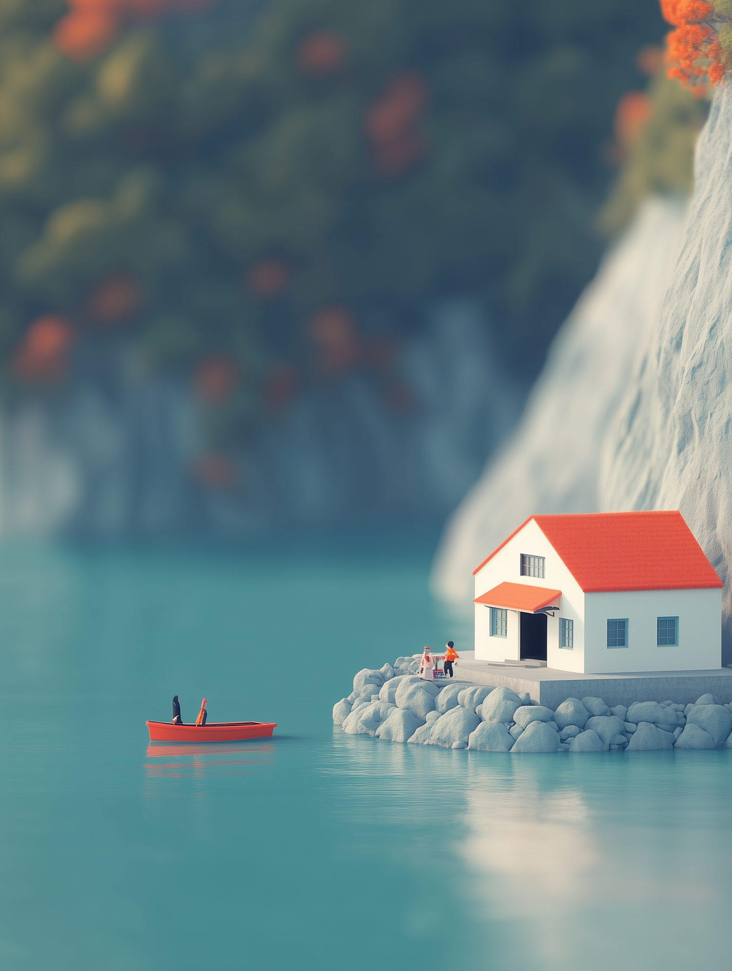 Charming lakeside house with red roof, rocky shore, and small boat. Autumn colors in the background create a serene atmosphere.