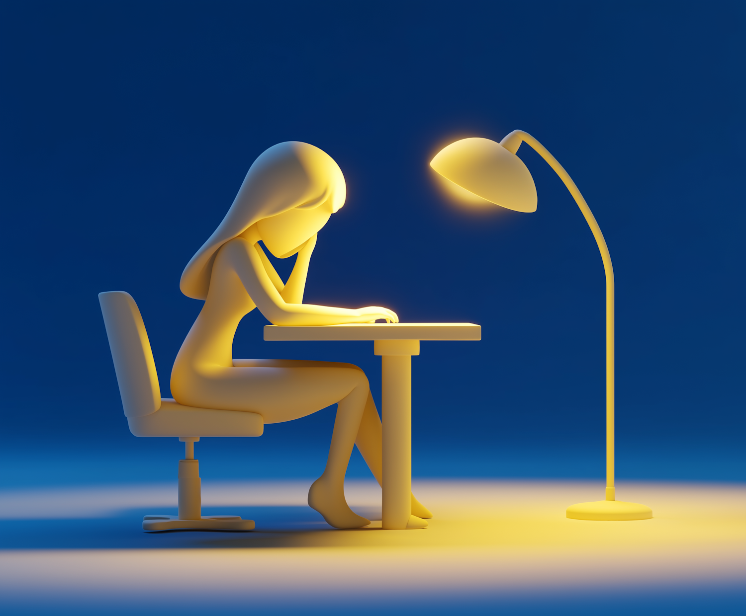 Minimalist 3D illustration of a figure at a desk under a lamp, in a contemplative pose, with a striking yellow and blue color scheme.
