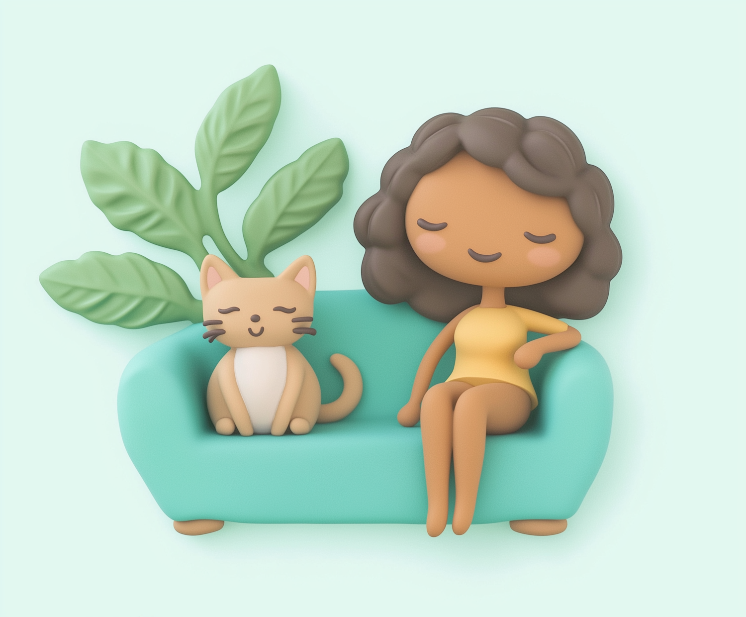 Charming cartoon woman and cat relaxing on a teal sofa with green leaves in a pastel setting.
