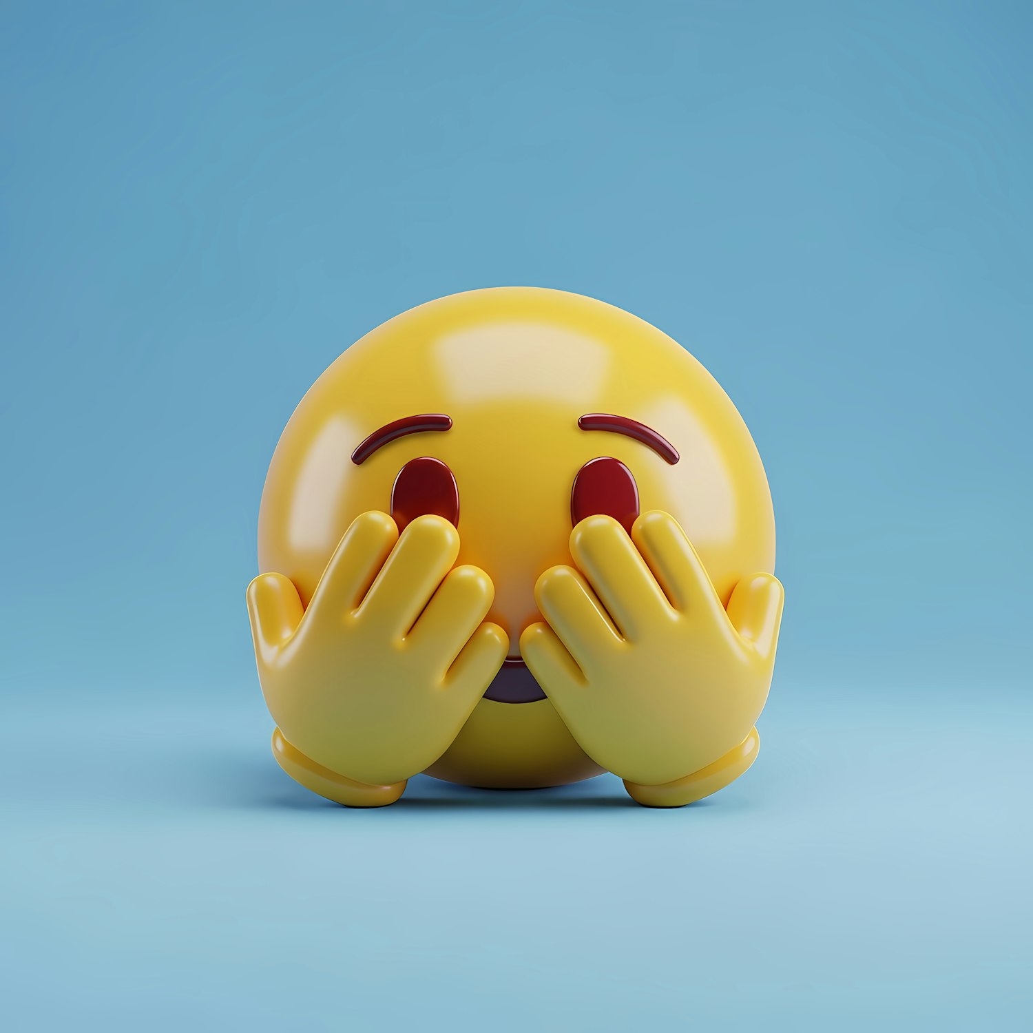 Adorable 3D emoji with a shy expression, covering its face with yellow hands against a bright blue background. Perfect for fun designs!