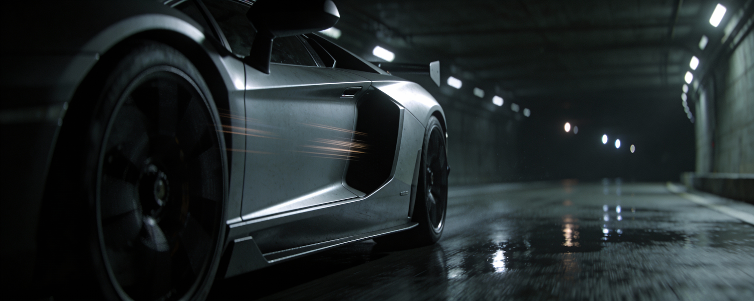 A silver sports car speeds through a dimly lit tunnel, with sparks flying and reflections on the wet pavement creating a dynamic scene.