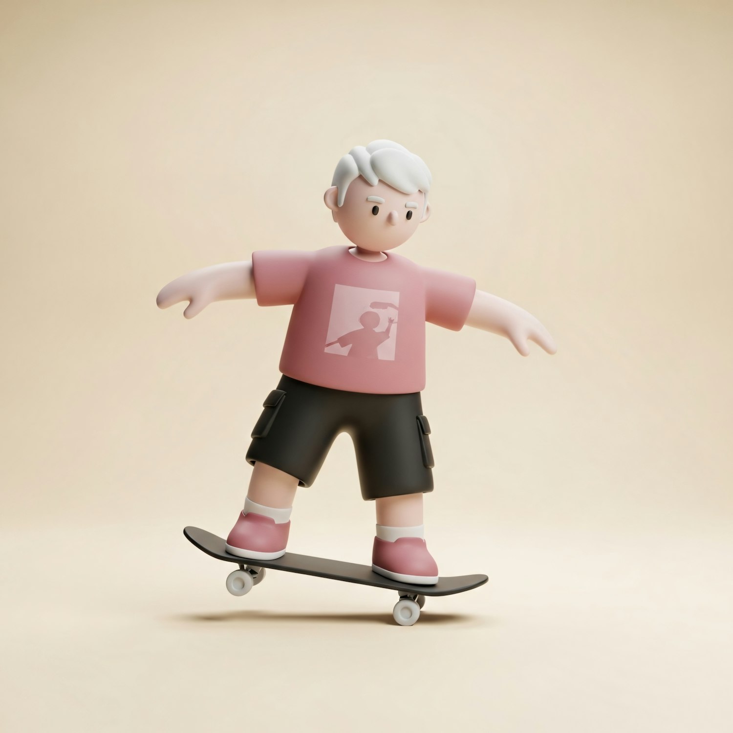 A 3D illustration of a cartoon character skateboarding, wearing a pink shirt and black shorts, set against a beige background.