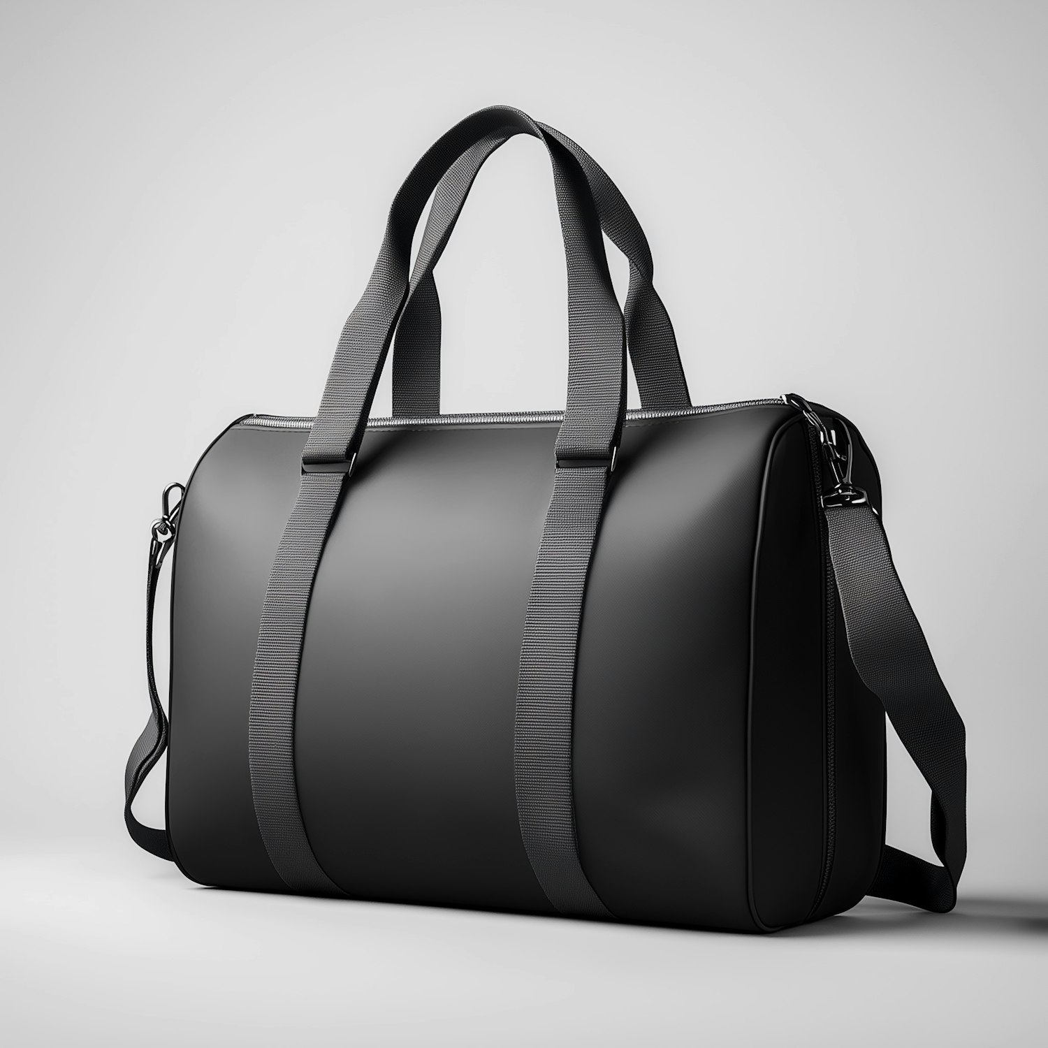 Sleek black duffel bag with matte finish, sturdy straps, and detachable shoulder strap. Modern design with clean lines and versatile use.