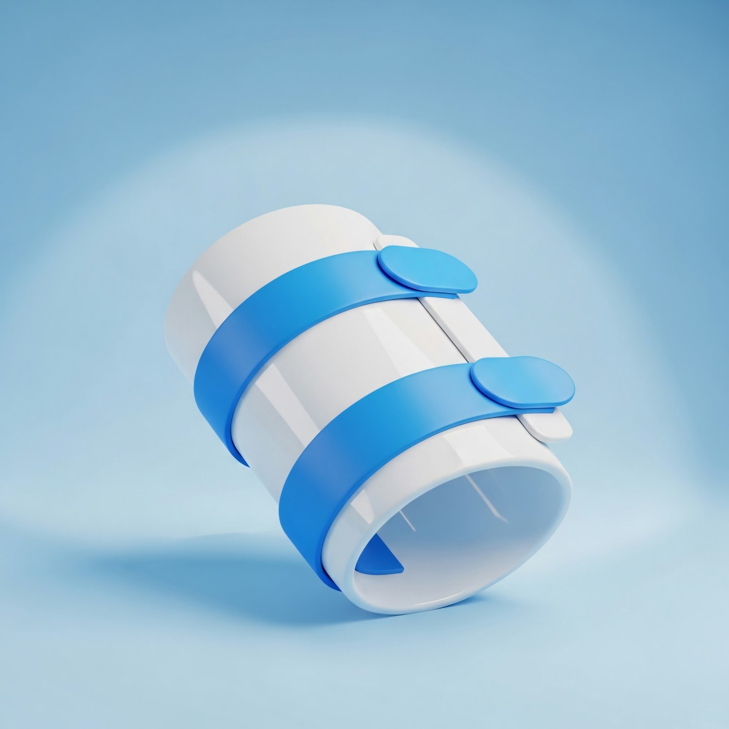 A sleek white cylindrical object with blue bands and tabs, set against a gradient blue background, showcasing modern and minimalistic design.