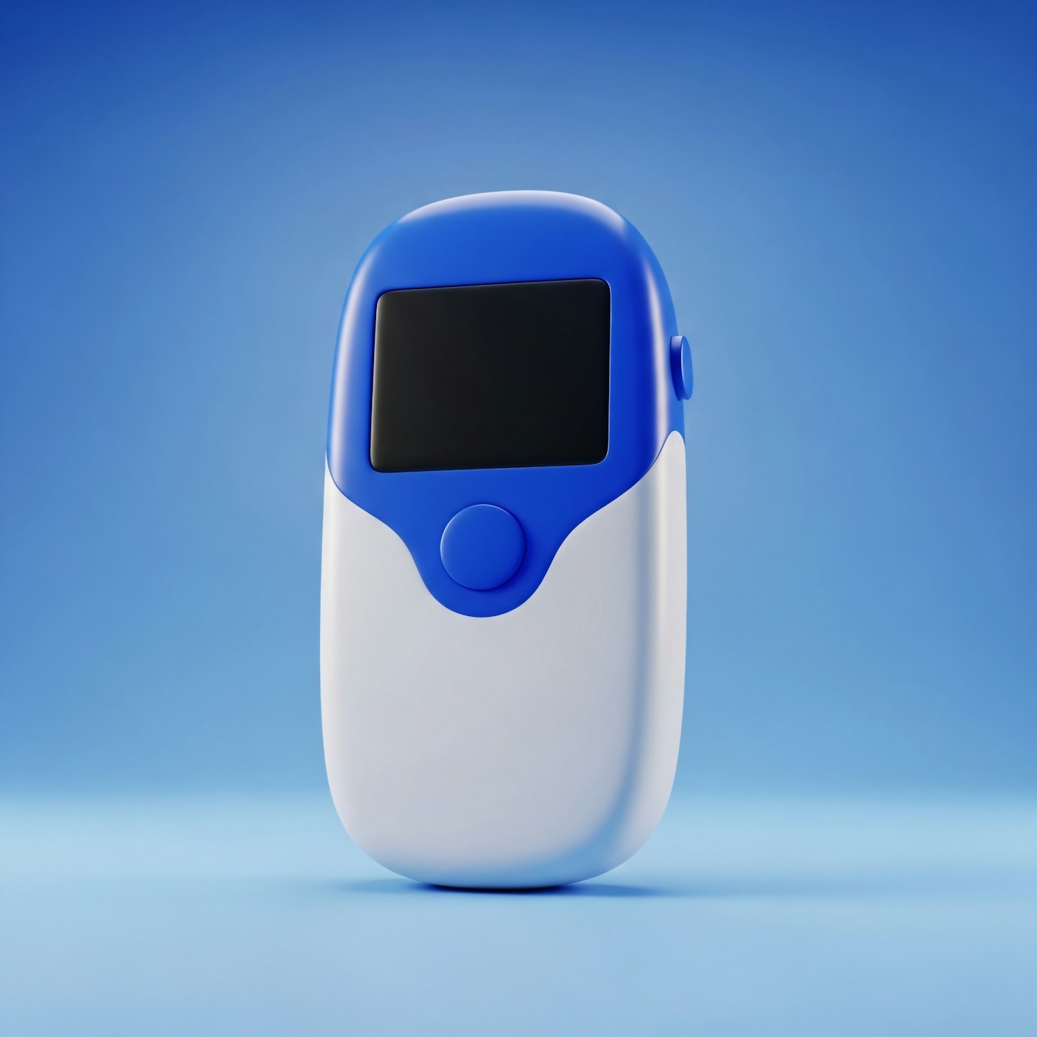 A sleek blue and white handheld device with a screen and button, set against a clean blue gradient background.