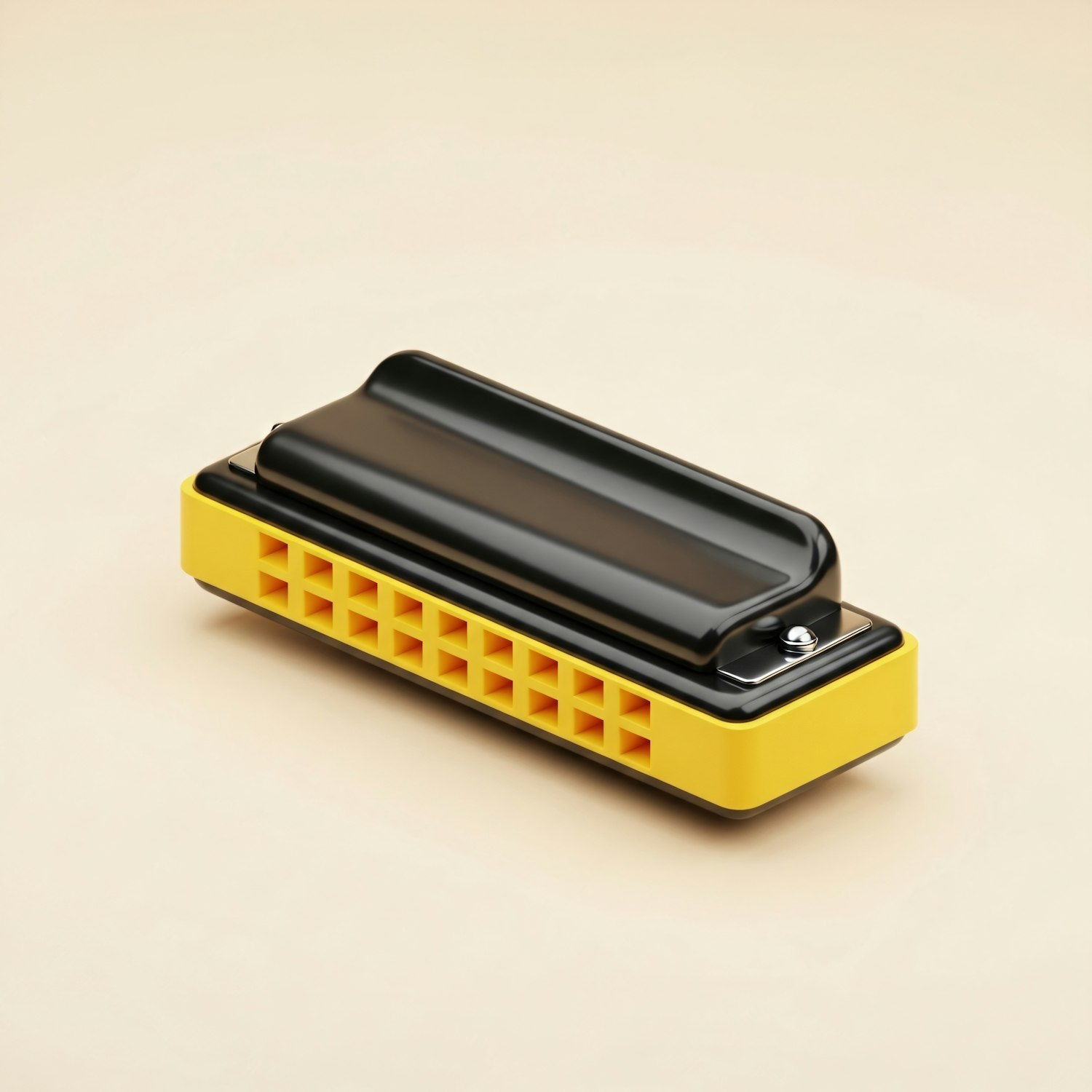 A stylish harmonica with a yellow body and black cover, set against a neutral background, showcasing its modern and vibrant design.