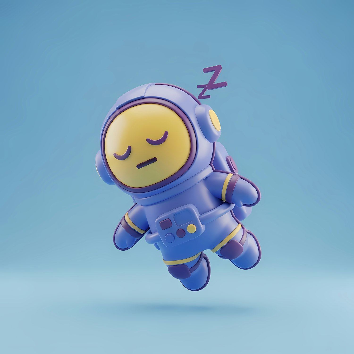 Adorable 3D astronaut character in a purple spacesuit, peacefully floating with a sleeping expression on a light blue background.