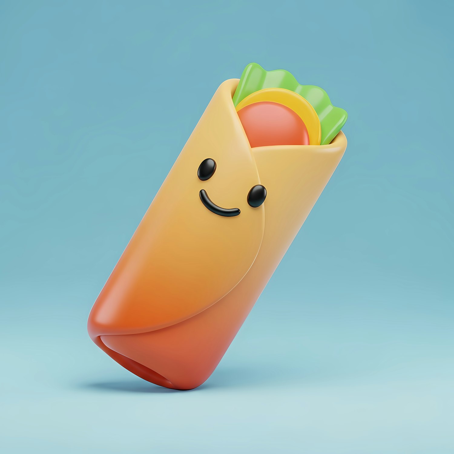 Adorable 3D burrito character with a smiling face, vibrant colors, and a fun design on a light blue background.