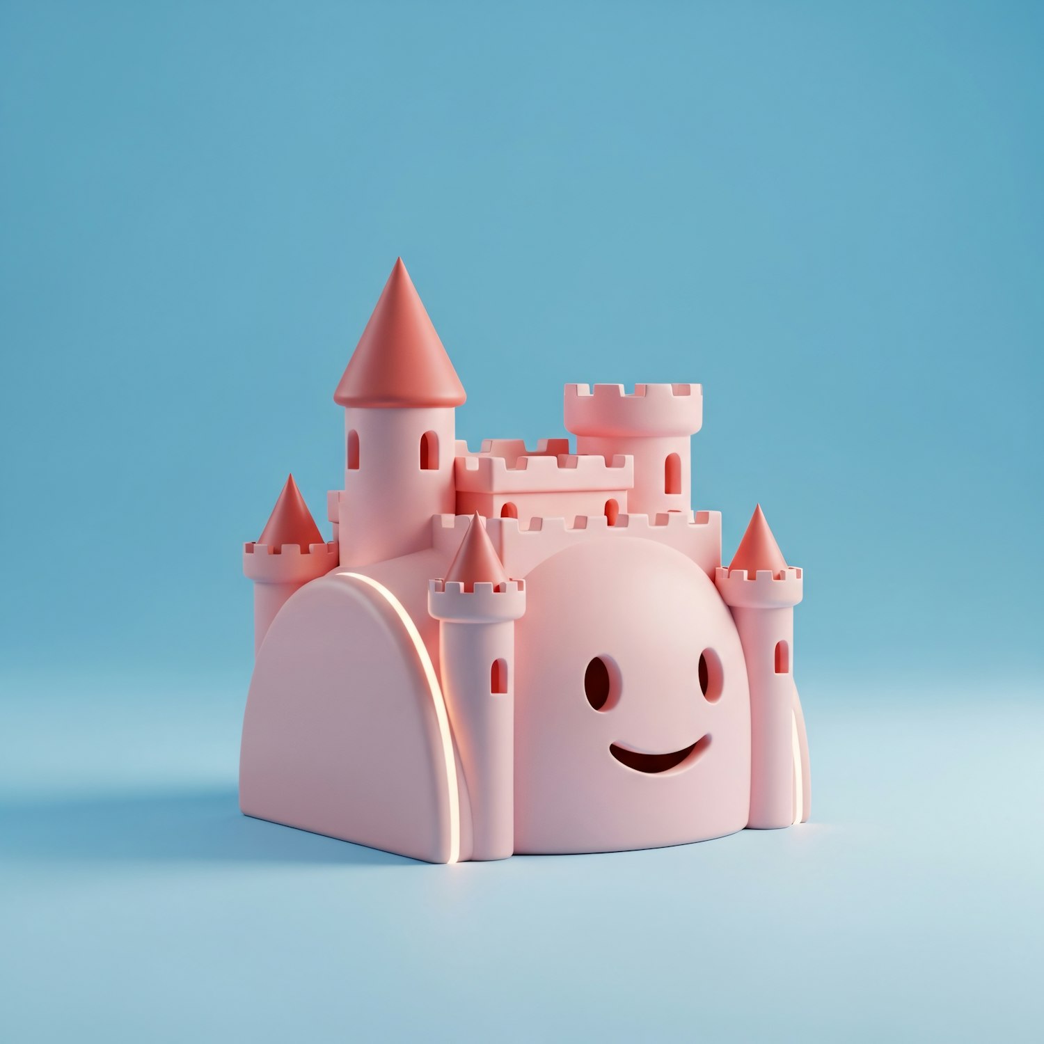 A cute pink castle with a smiling face, set against a light blue background, perfect for a playful and cheerful design.