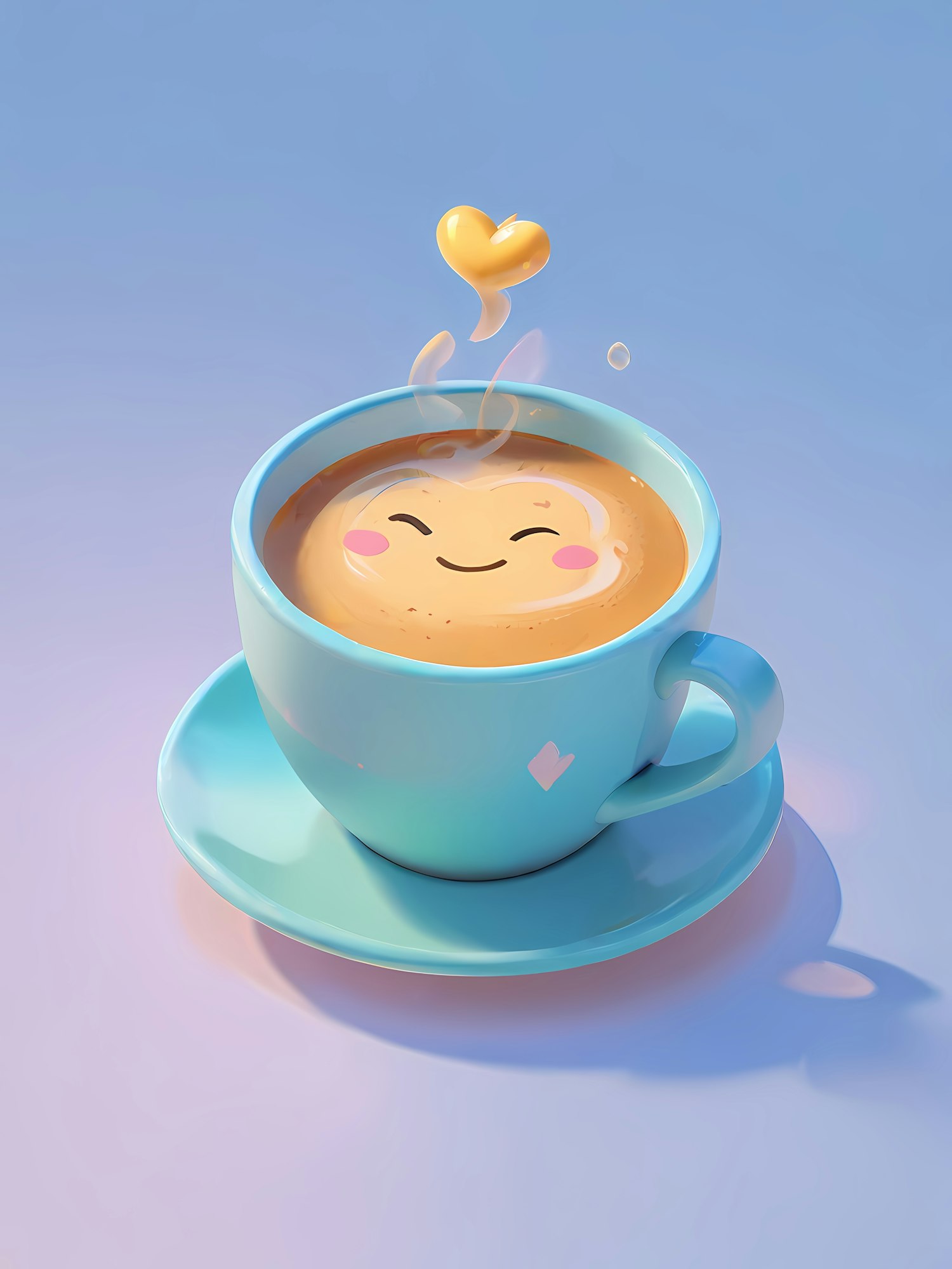 Adorable coffee cup with a smiling face and heart-shaped steam, set against a soft blue and lavender gradient background.