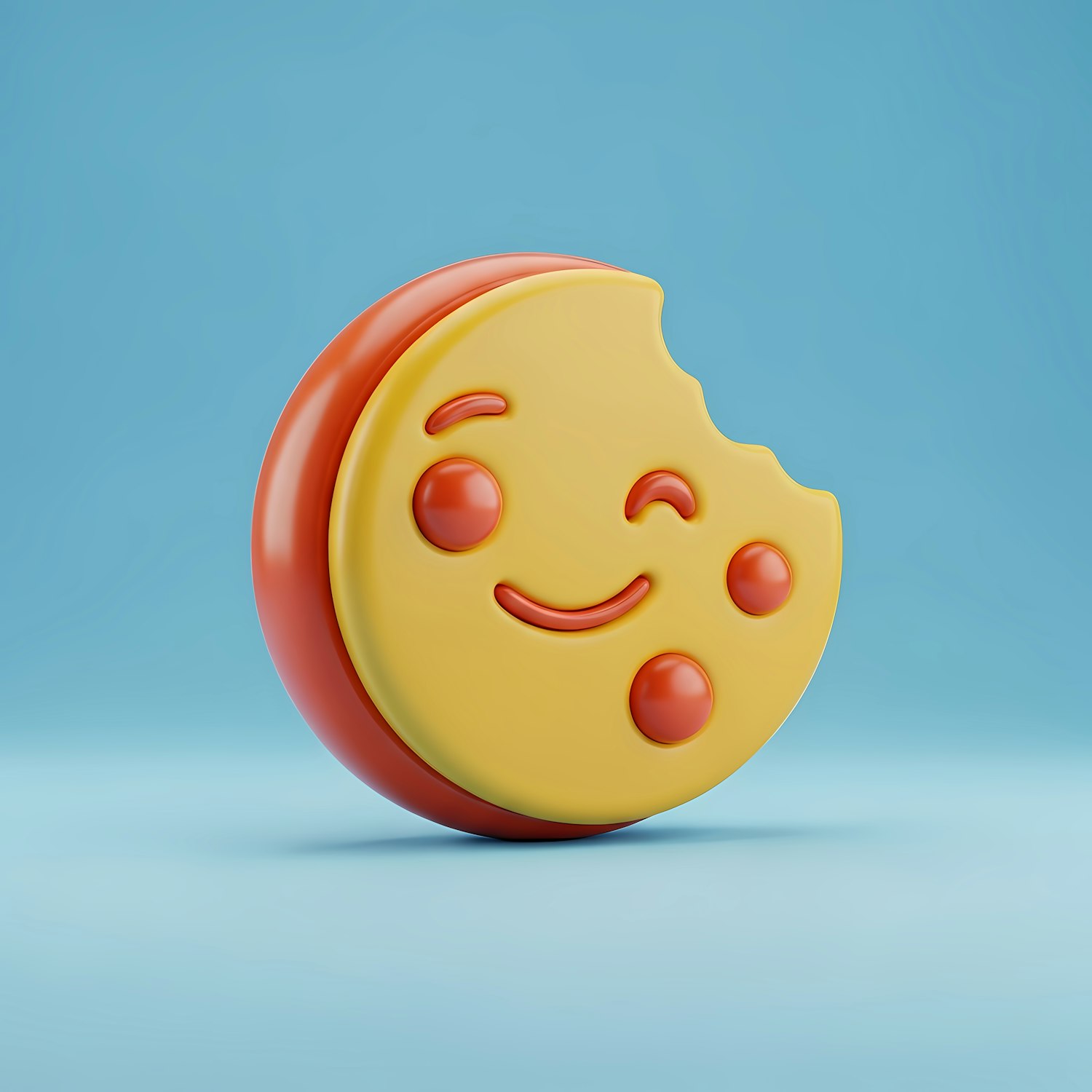 Cute 3D illustration of a smiling cookie with a bite taken out, set against a light blue background. Perfect for fun, playful designs.