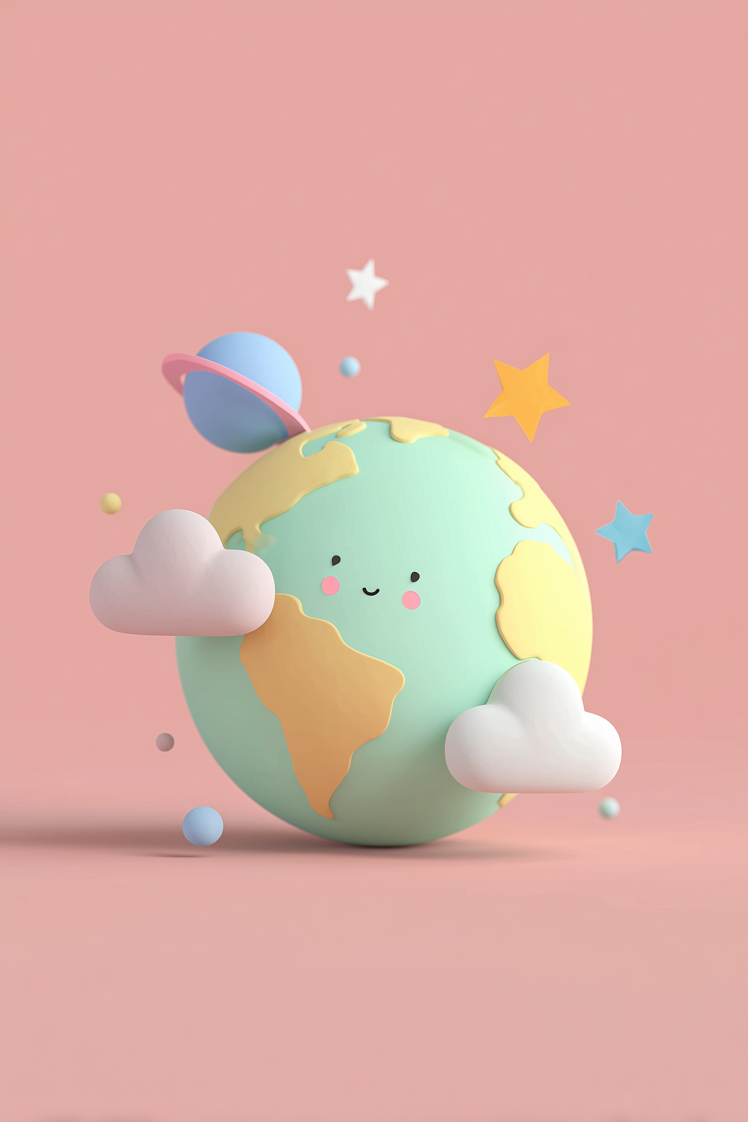 Adorable cartoon Earth with a smiling face, surrounded by clouds, stars, and a ringed planet on a soft pink background.