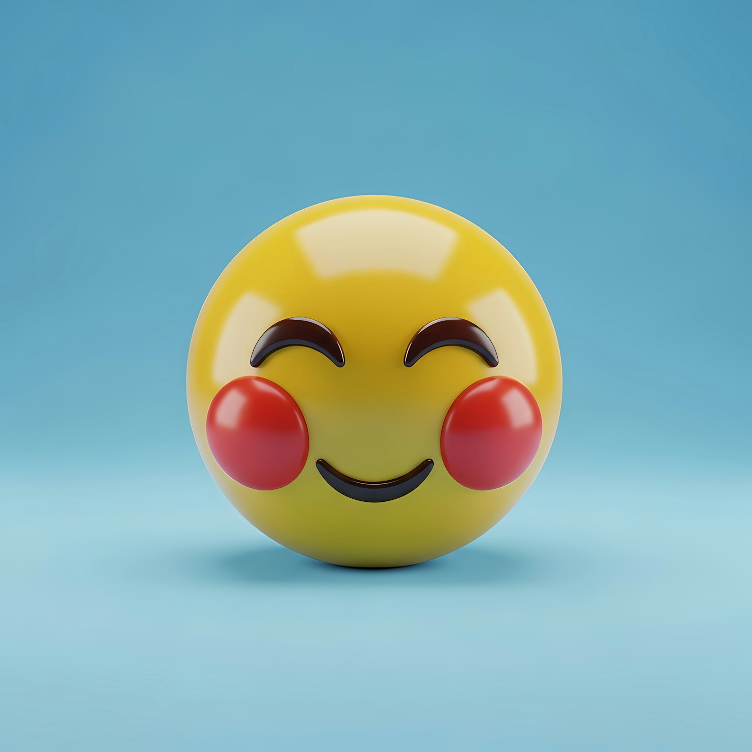Bright 3D emoji with a cheerful smile and red cheeks on a light blue background, perfect for adding a playful touch to any design.