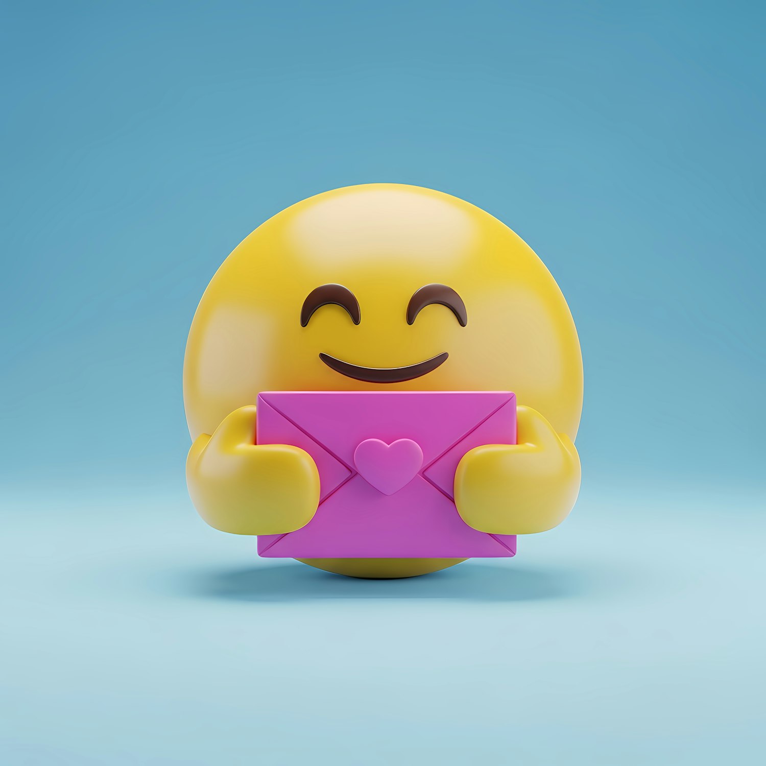 A cheerful 3D emoji holding a pink envelope with a heart, set against a light blue background. Perfect for love or affection themes.