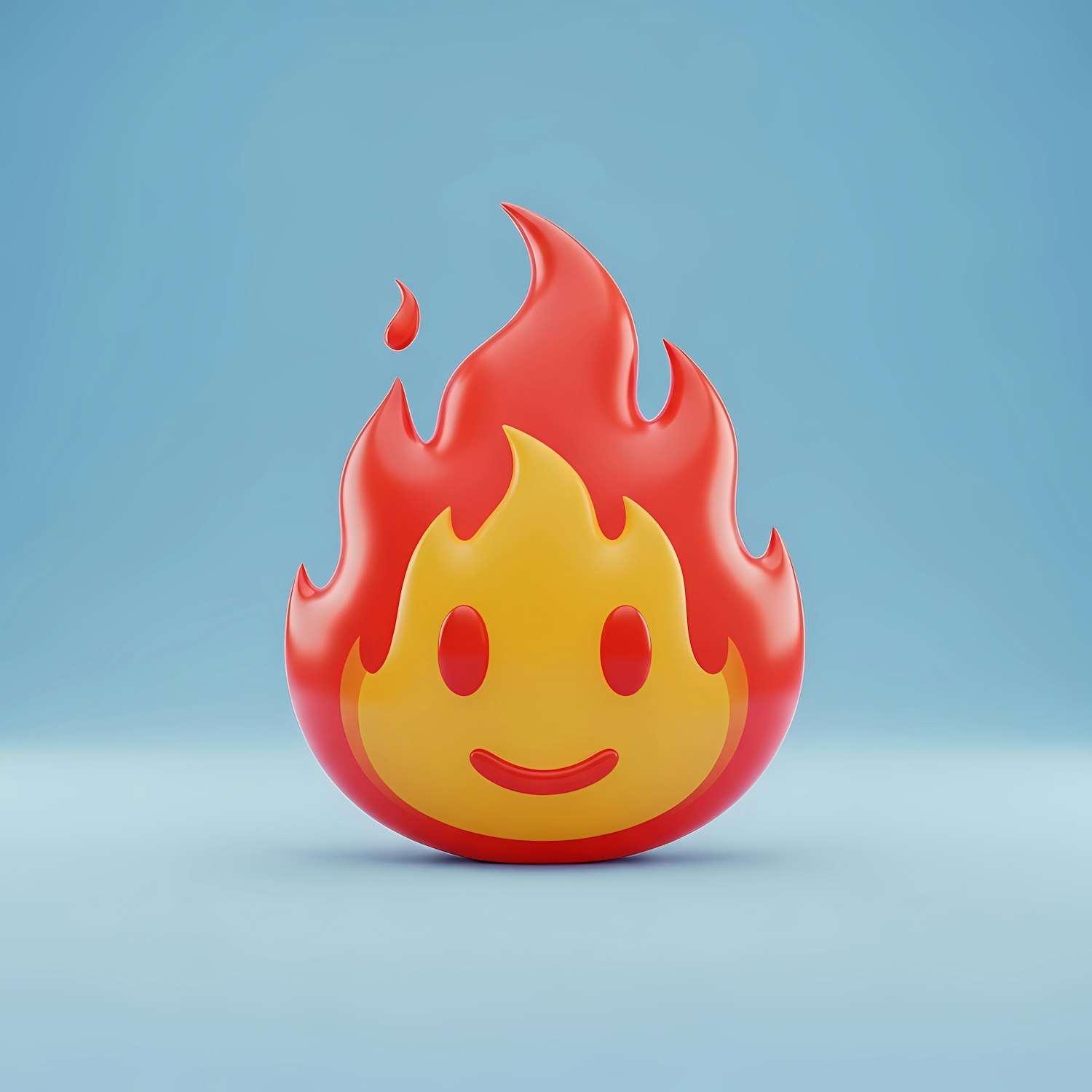 3D flame emoji with a cheerful face, blending red and yellow tones, on a clean light blue background. Fun and vibrant design!