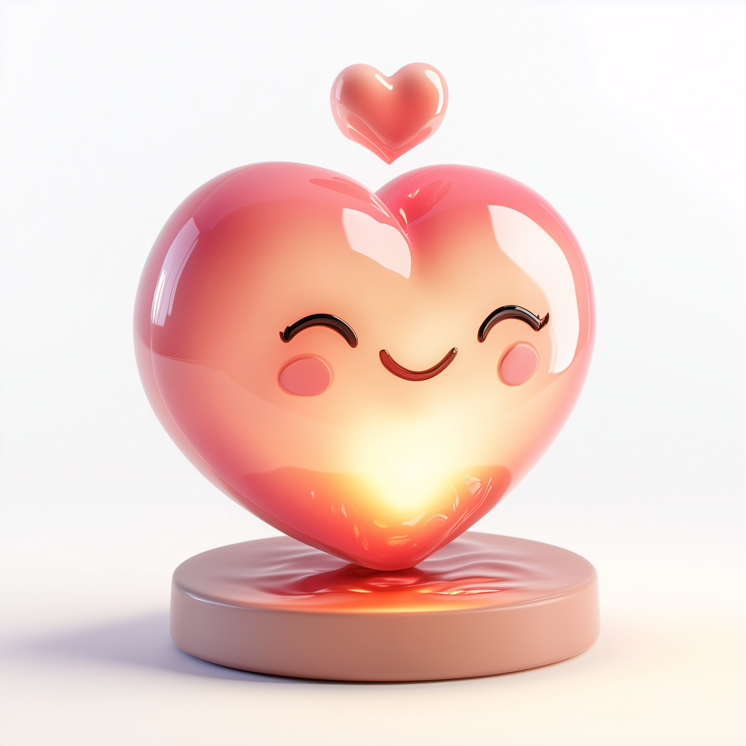Cute 3D heart with a smiling face and glowing effect, floating above a base. Perfect for Valentine's or love-themed designs.
