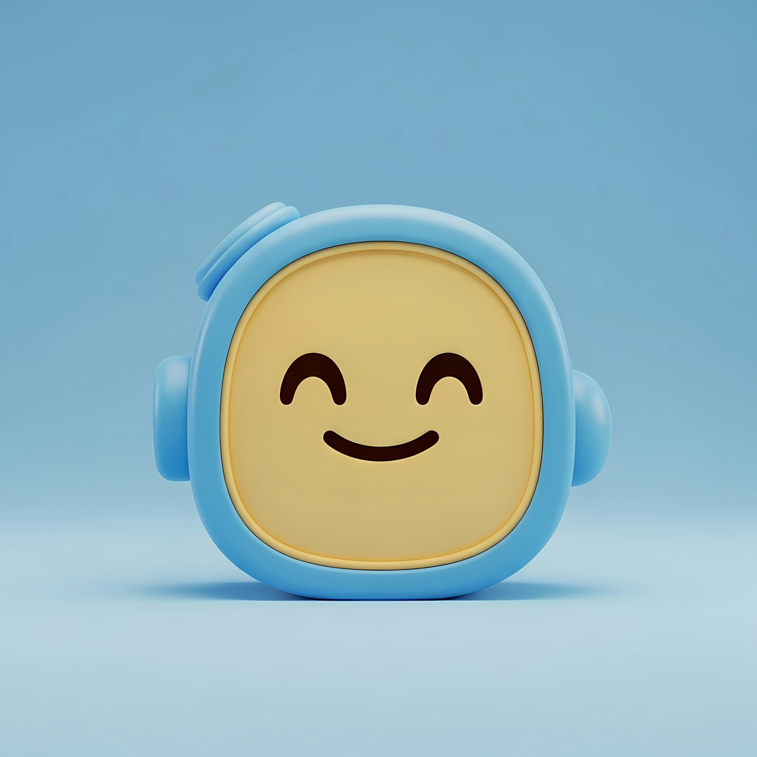 Adorable 3D-rendered robot face with a blue casing and cheerful smile, set against a light blue background. Perfect for tech or AI themes.