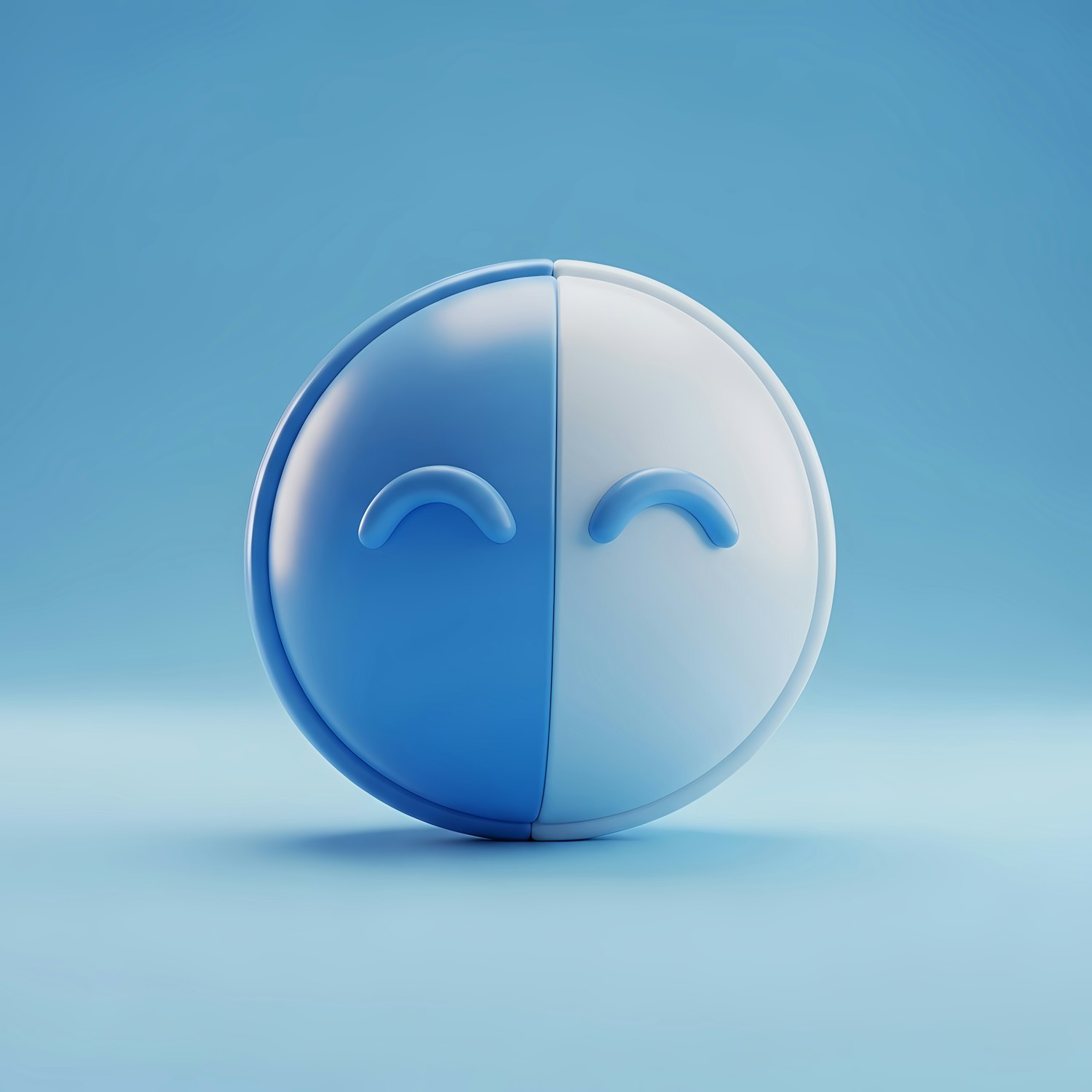 A 3D-rendered sphere with a smiling face, split into blue and white halves, set against a soft blue gradient background.