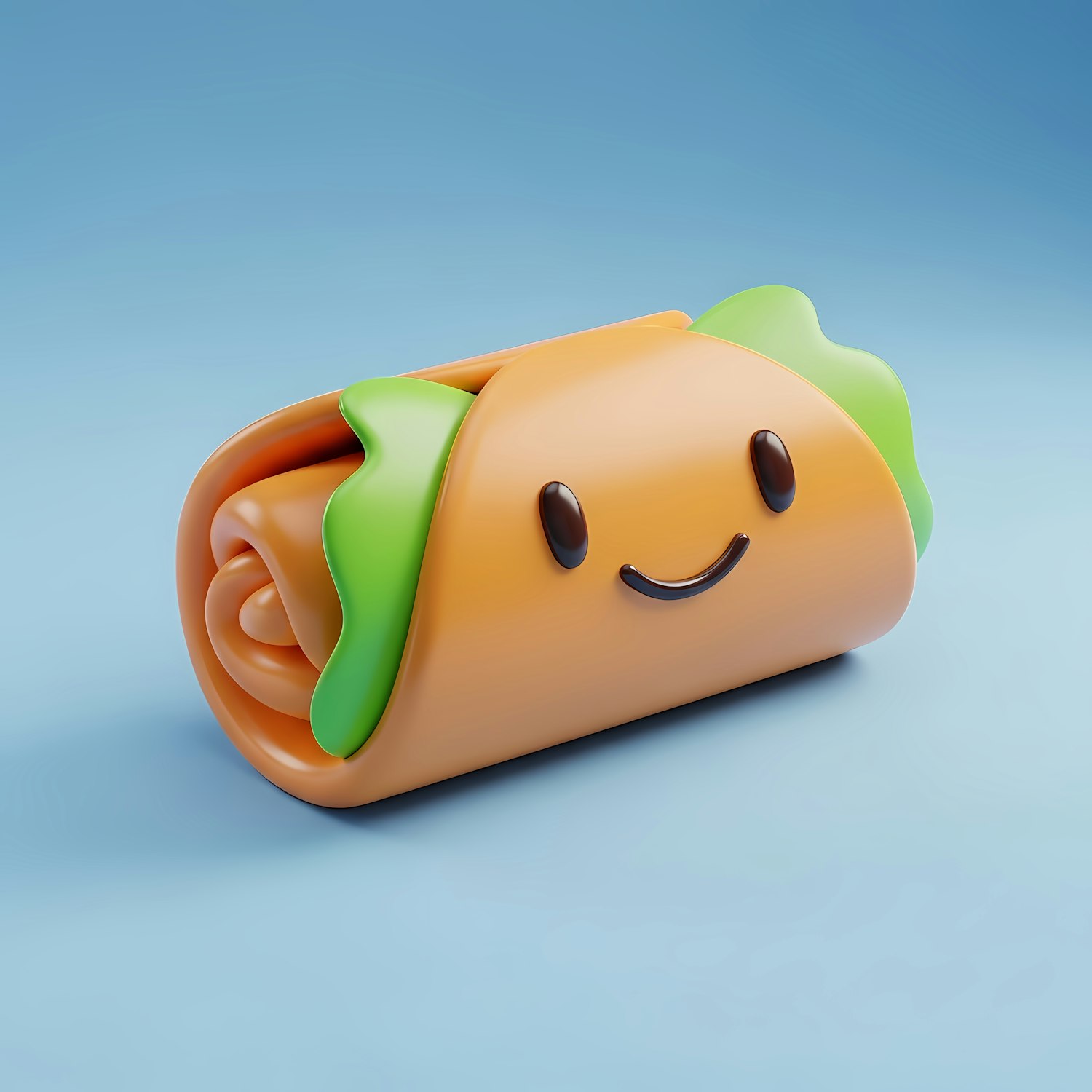 Adorable 3D taco character with a smiling face, orange shell, and green lettuce on a light blue background. Perfect for fun designs!