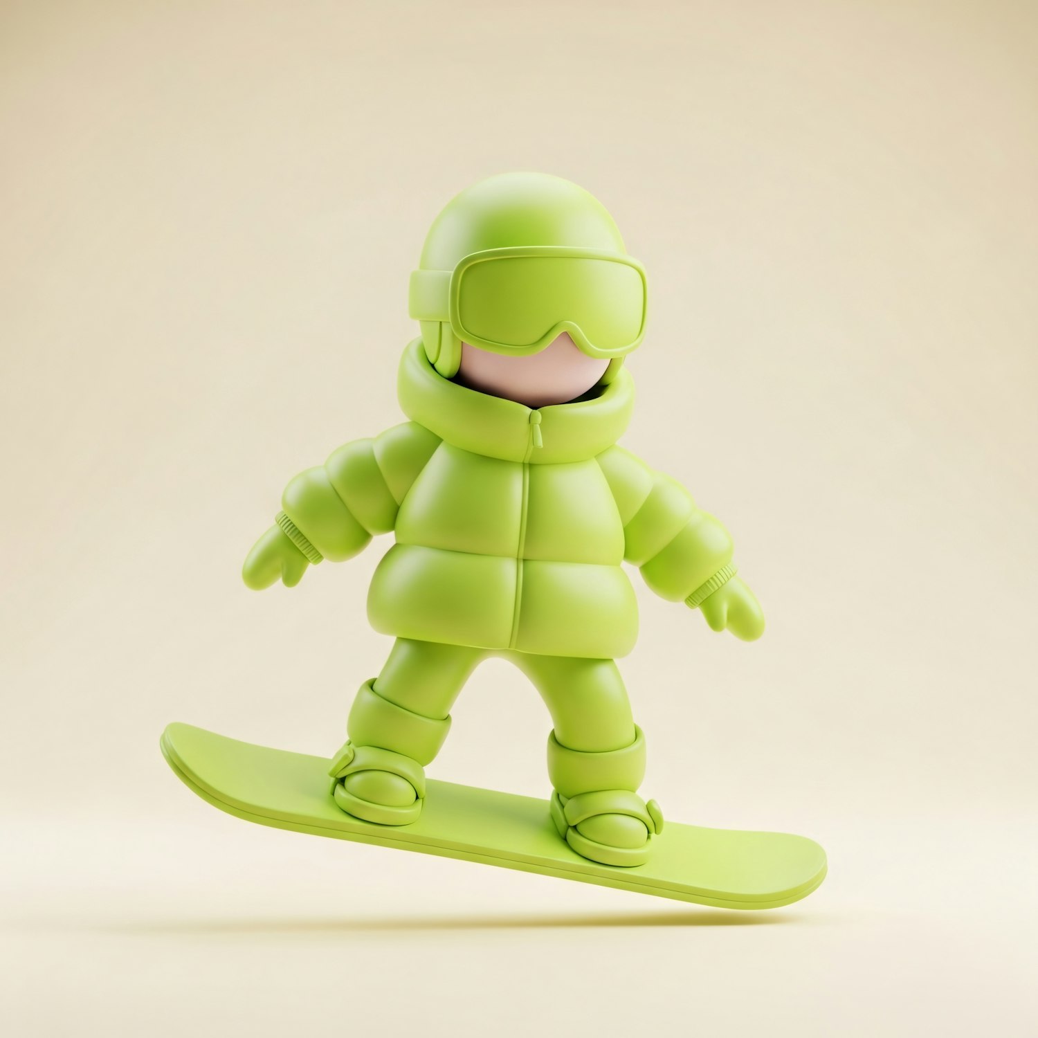 A vibrant 3D-rendered lime-green snowboarder figure in a dynamic pose, set against a neutral background for a striking visual.