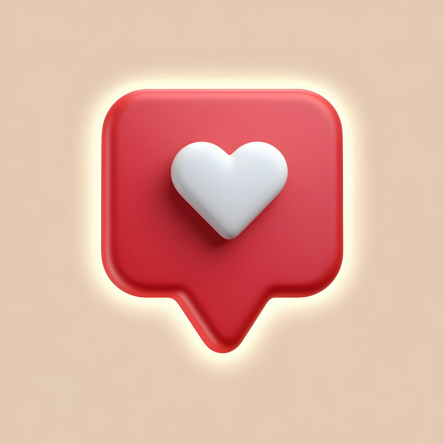 3D-rendered red notification bubble with a glowing white heart icon, symbolizing social media likes, on a soft beige background.