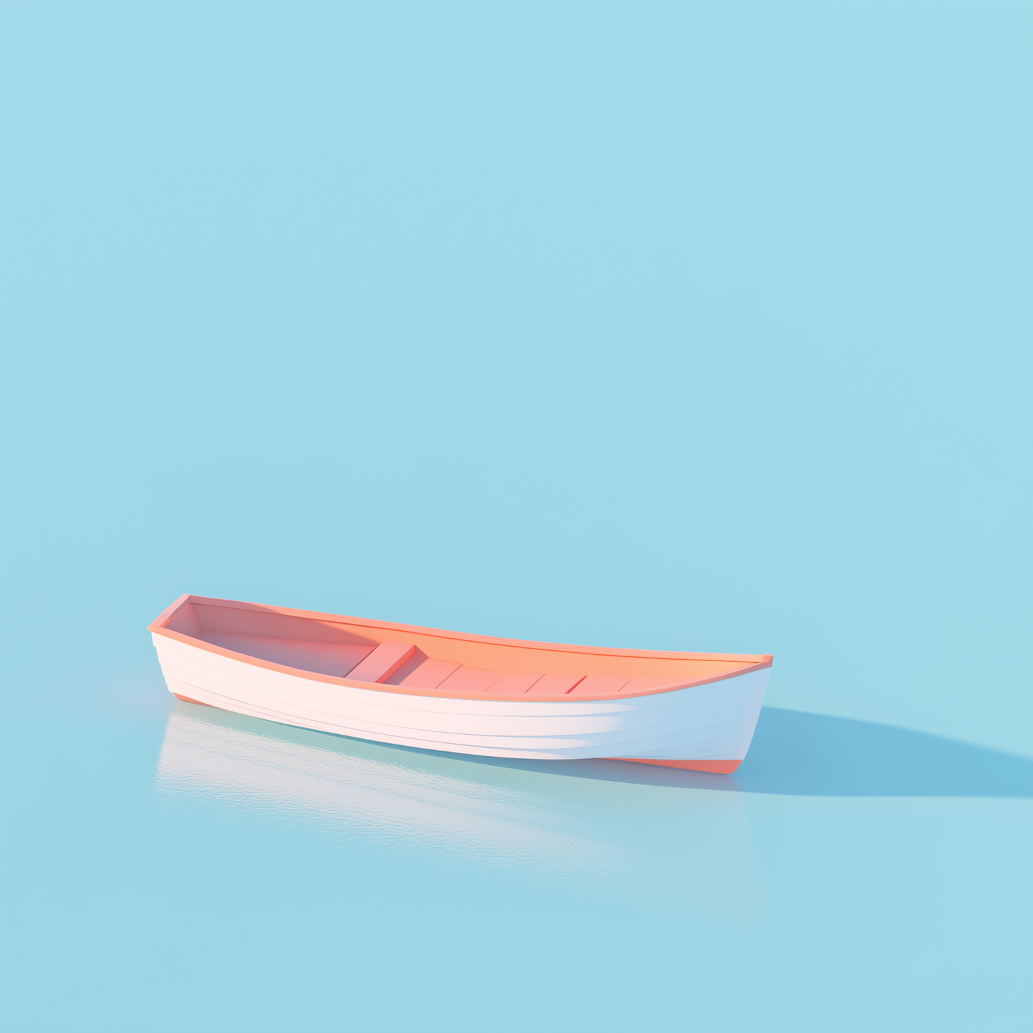 Minimalist 3D rendering of a white and pink boat on a calm blue surface, creating a serene and tranquil atmosphere.