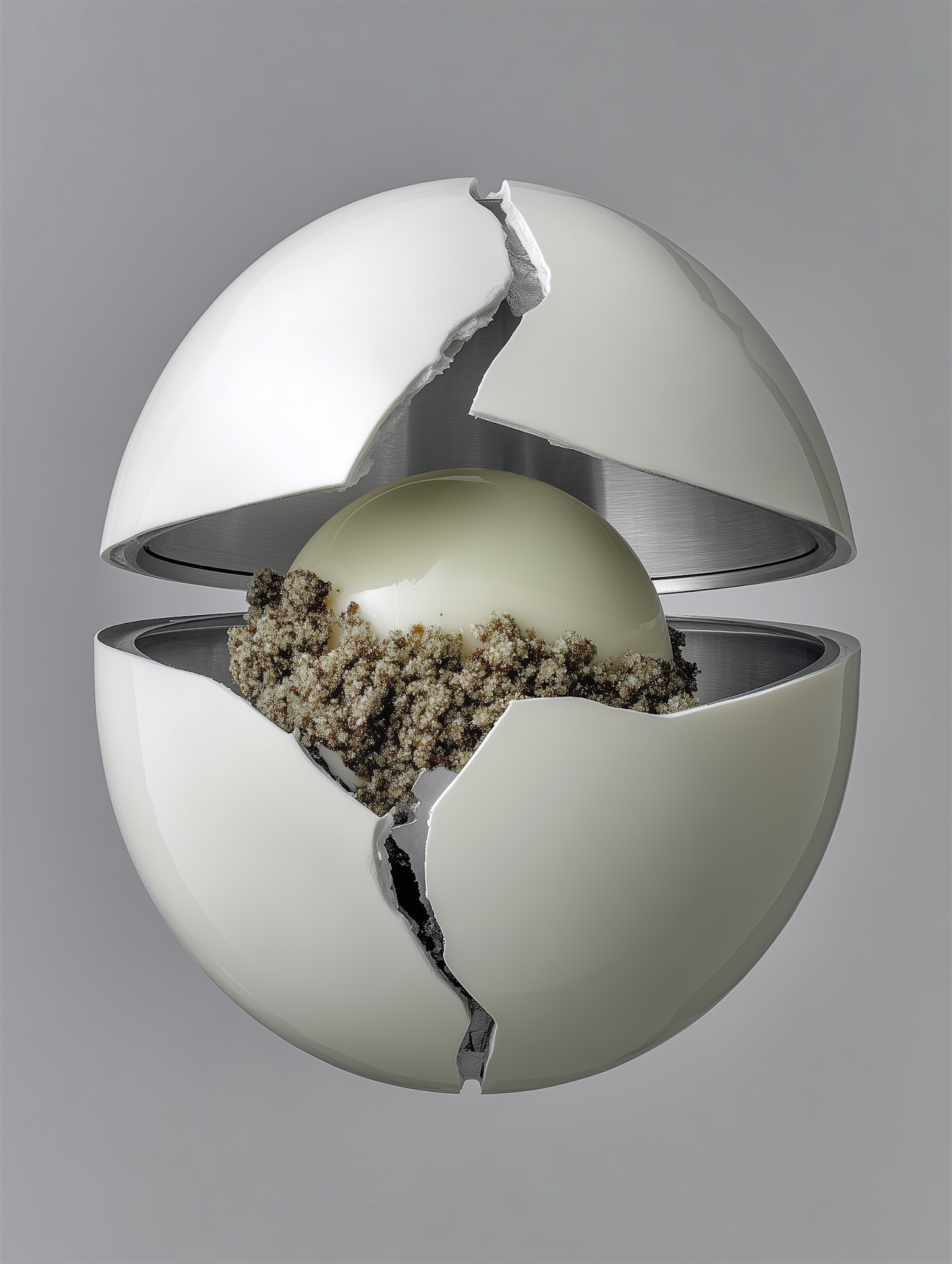 A cracked white sphere reveals a smaller sphere surrounded by textured material, set against a neutral gray background.