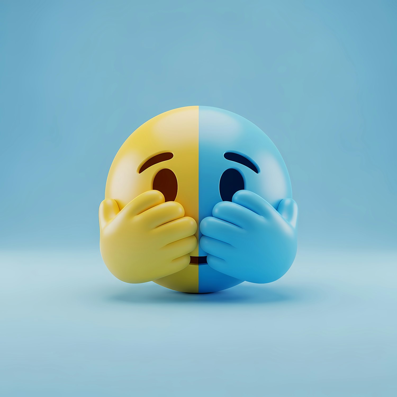 3D emoji with a split yellow and blue face, covering its mouth with matching hands, on a light blue background.
