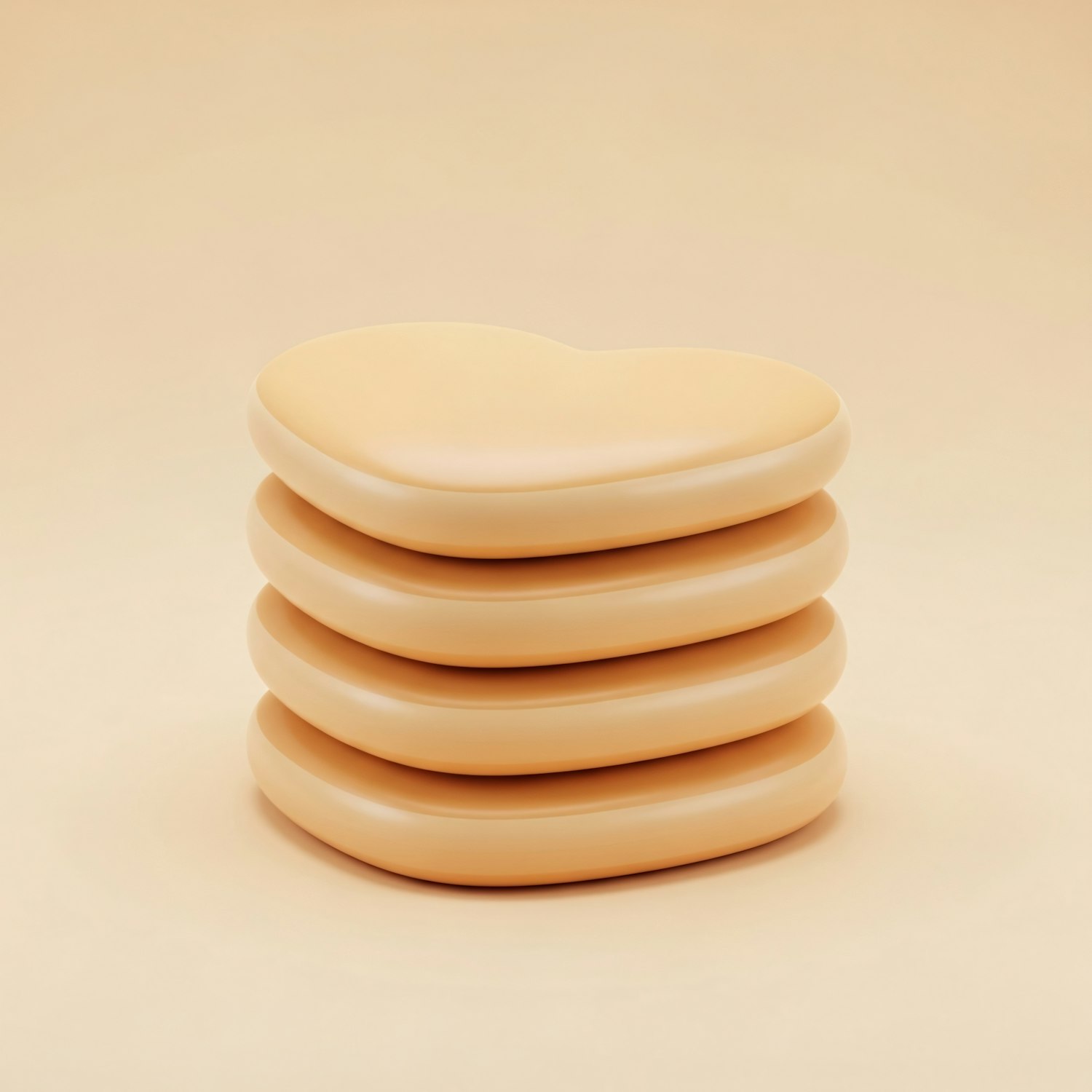 A stack of four glossy, heart-shaped beige objects on a matching beige background, creating a minimalist and modern aesthetic.