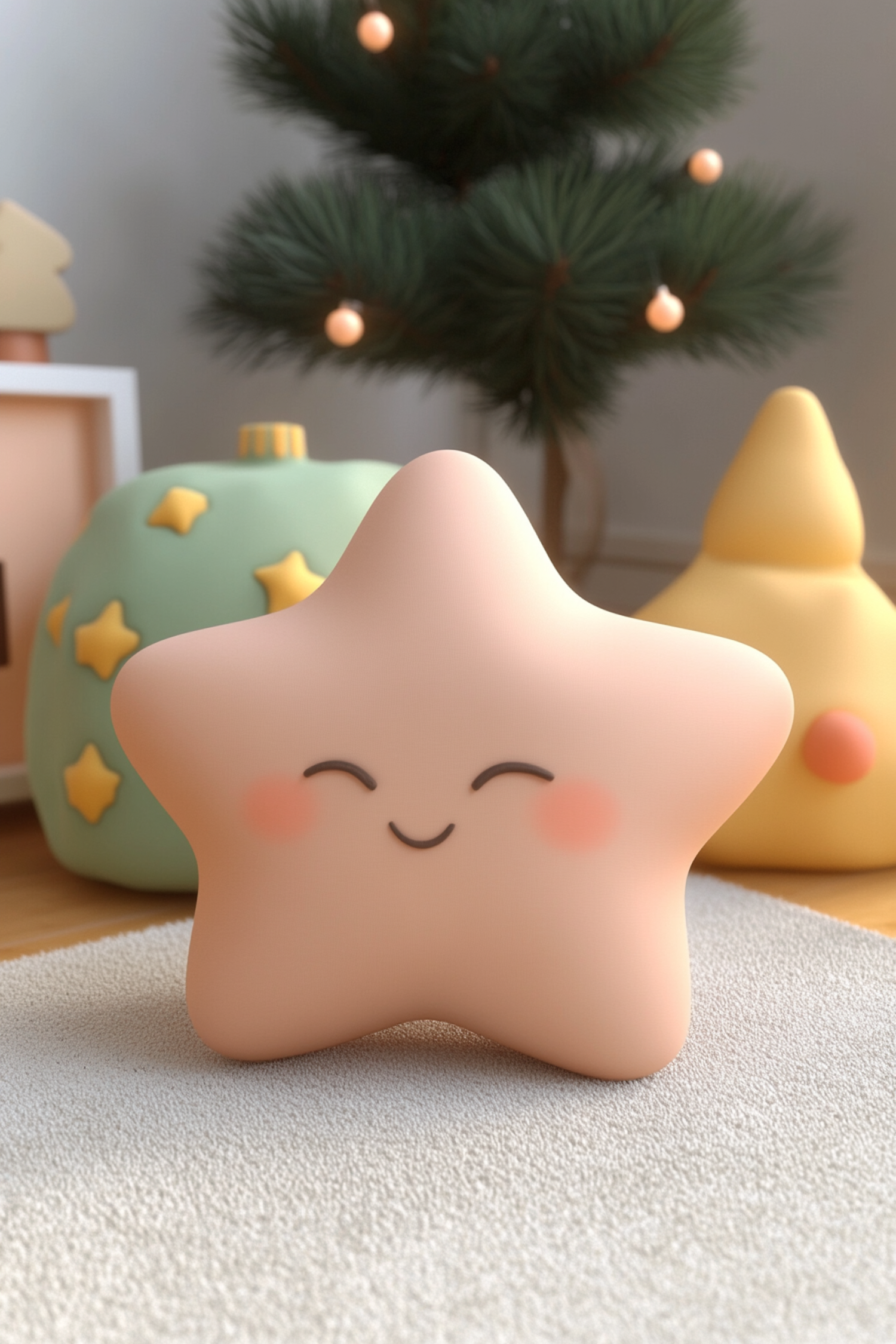 Adorable peach star plush with a smiling face on a cozy white surface, surrounded by festive decor and soft pastel colors.