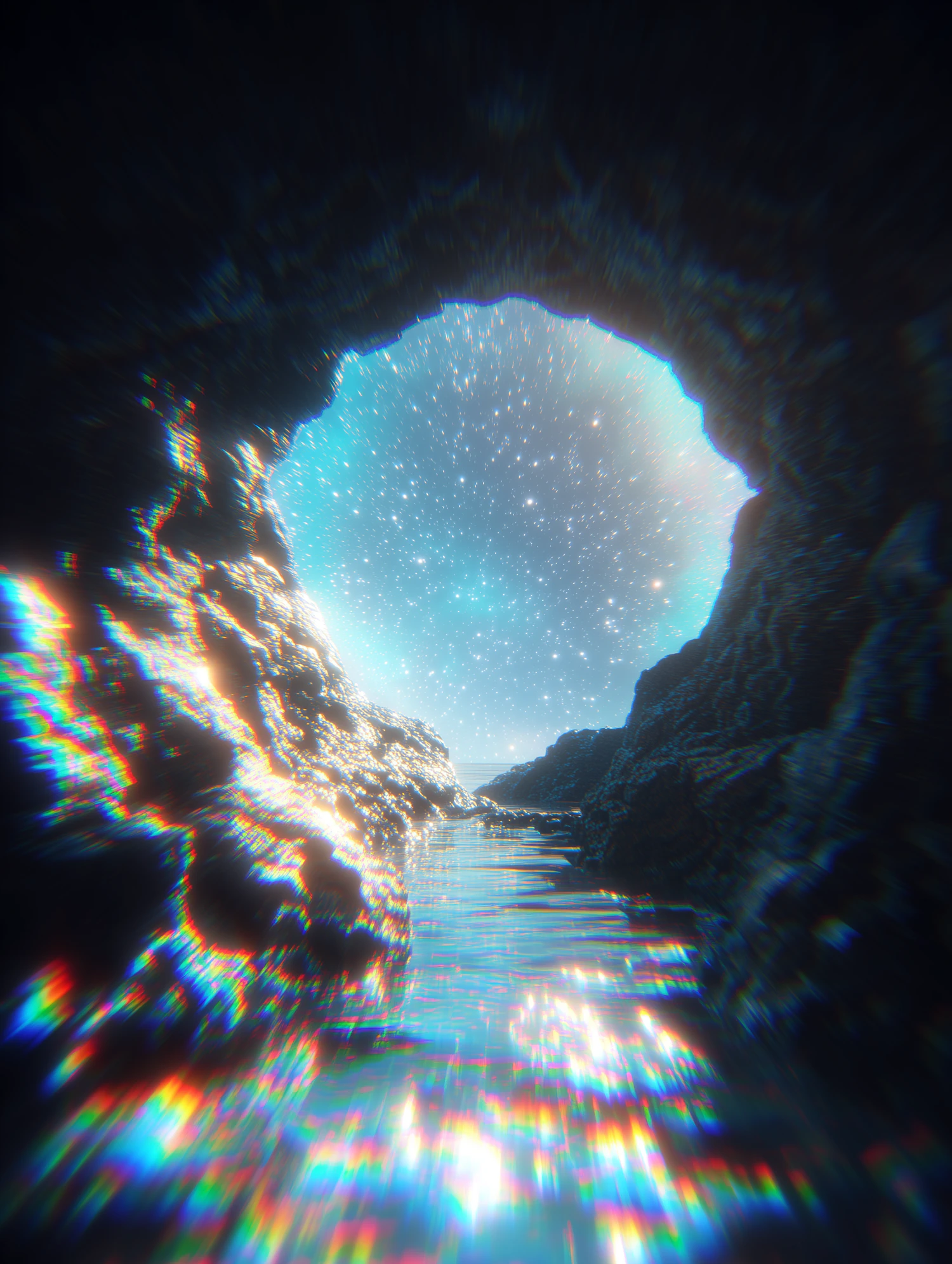 A stunning cave view with colorful reflections on water and a starry sky beyond, creating a magical and serene atmosphere.