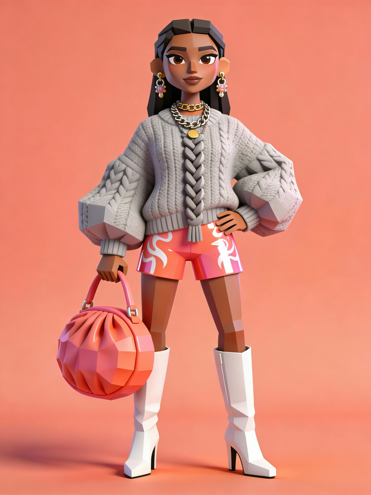 Stylized 3D character in a chic outfit with a gray sweater, pink shorts, white boots, and a coral handbag, set against a peach background.