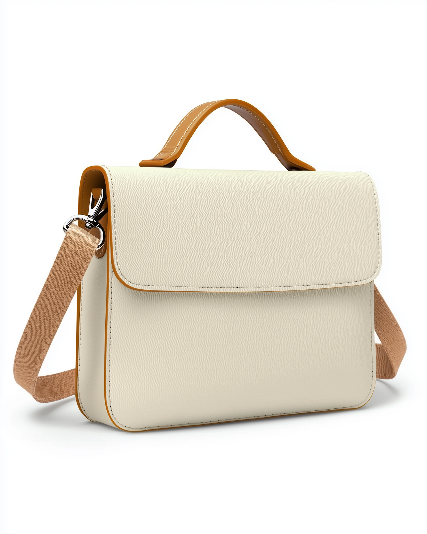 Elegant cream handbag with tan accents, featuring a top handle and shoulder strap. Perfect for versatile, stylish use.