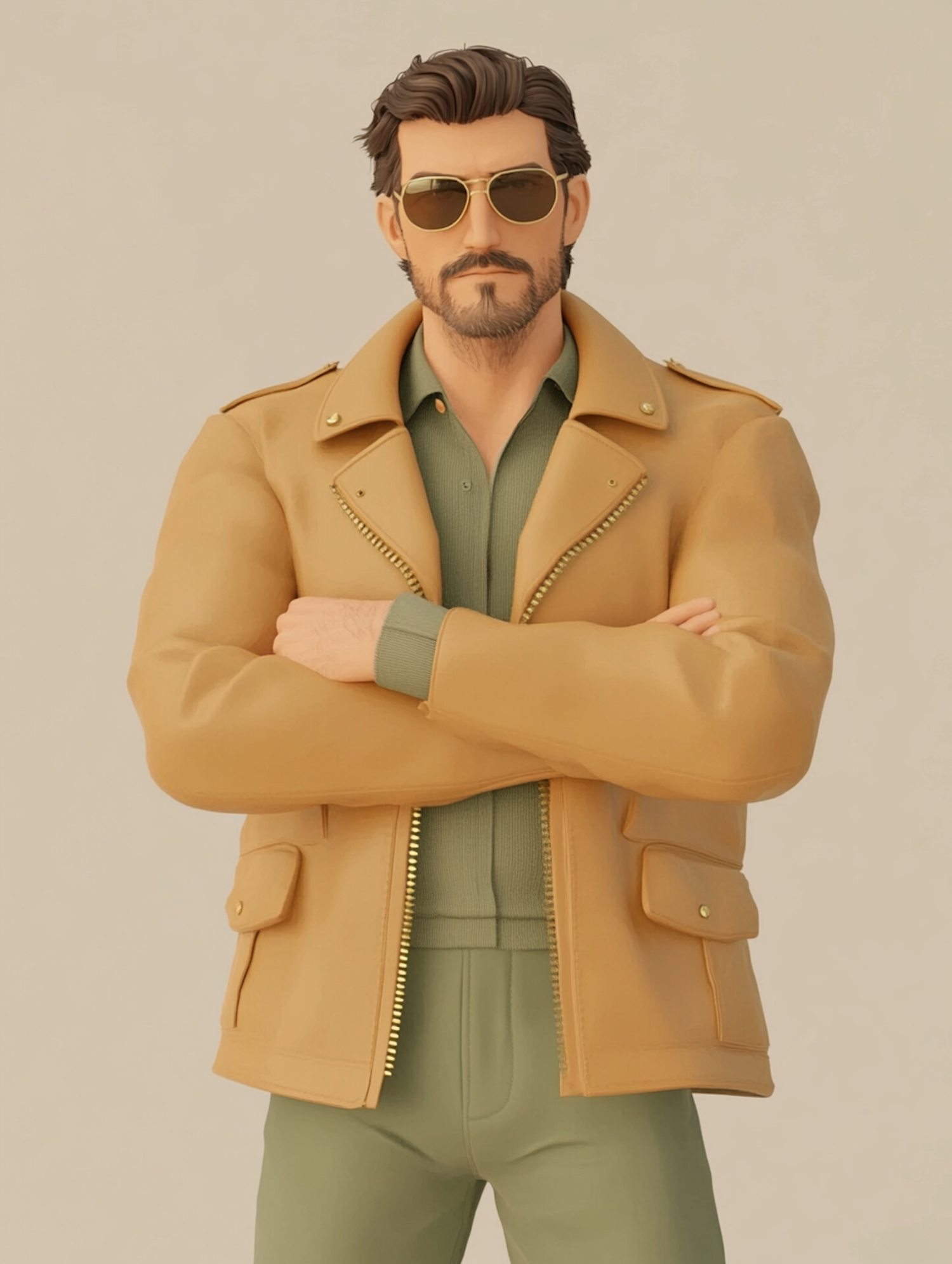 Animated male character in a tan leather jacket, green outfit, and aviator sunglasses, exuding a modern and stylish vibe.