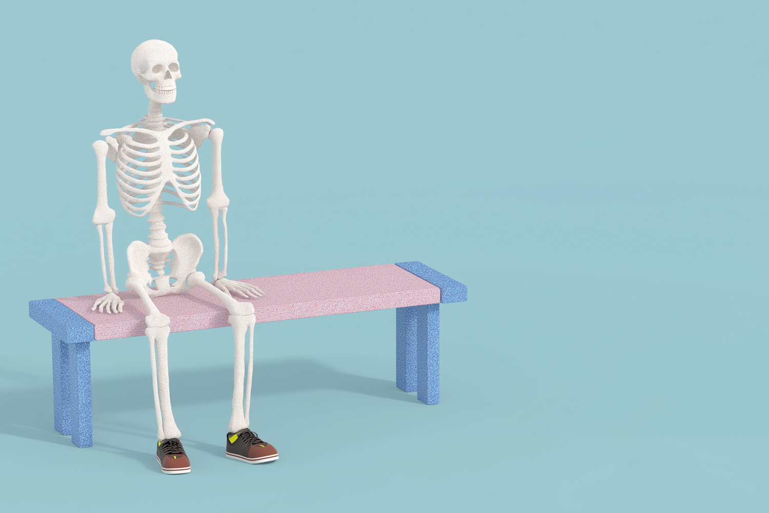 A whimsical 3D skeleton sits on a pastel bench, styled with sneakers against a bright blue background, blending humor with artistic design.