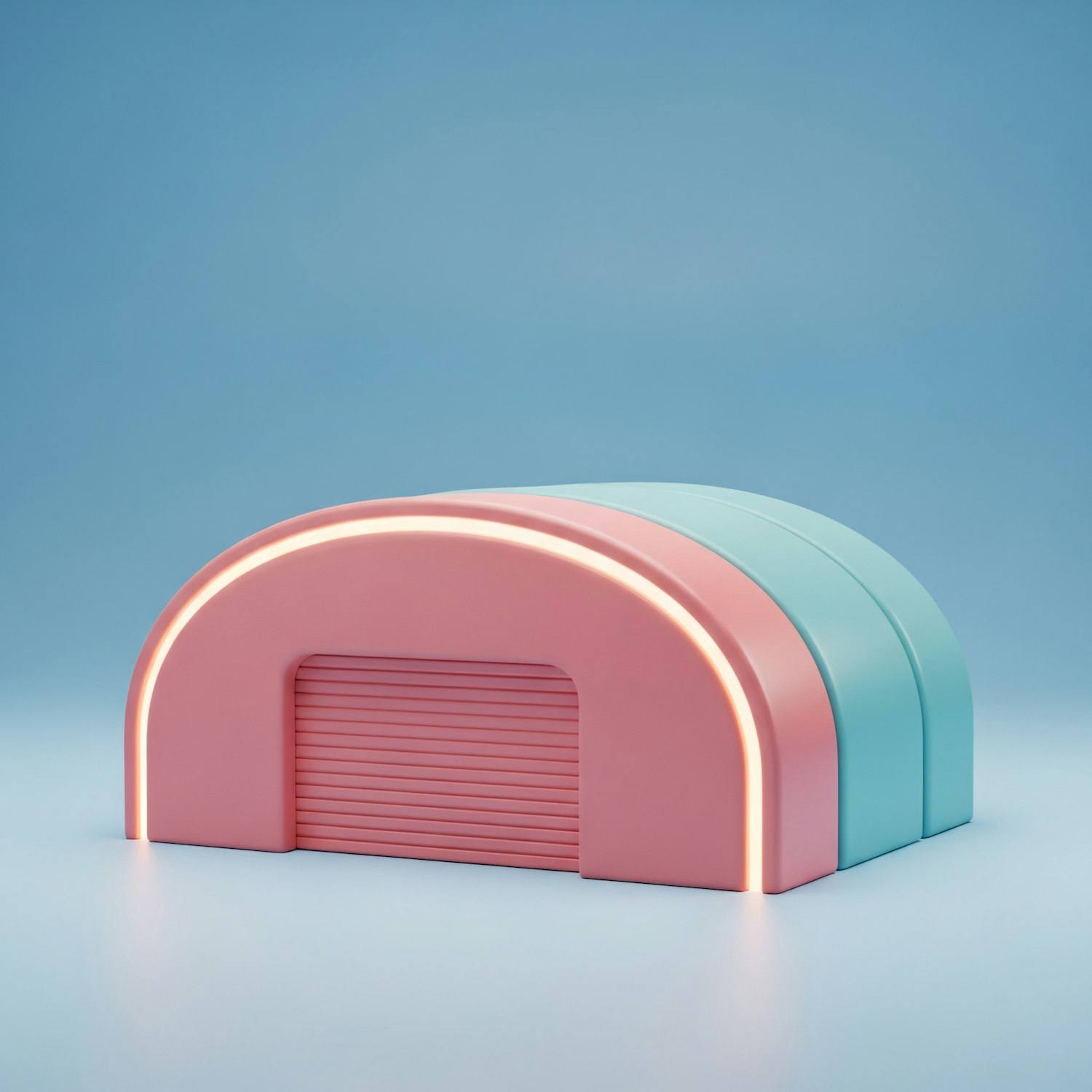 A 3D-rendered pastel pink and blue arched structure with glowing accents, set against a clean blue gradient background.