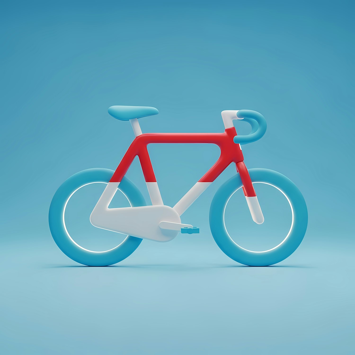 A vibrant 3D illustration of a red, white, and blue bicycle with a modern design on a light blue background.