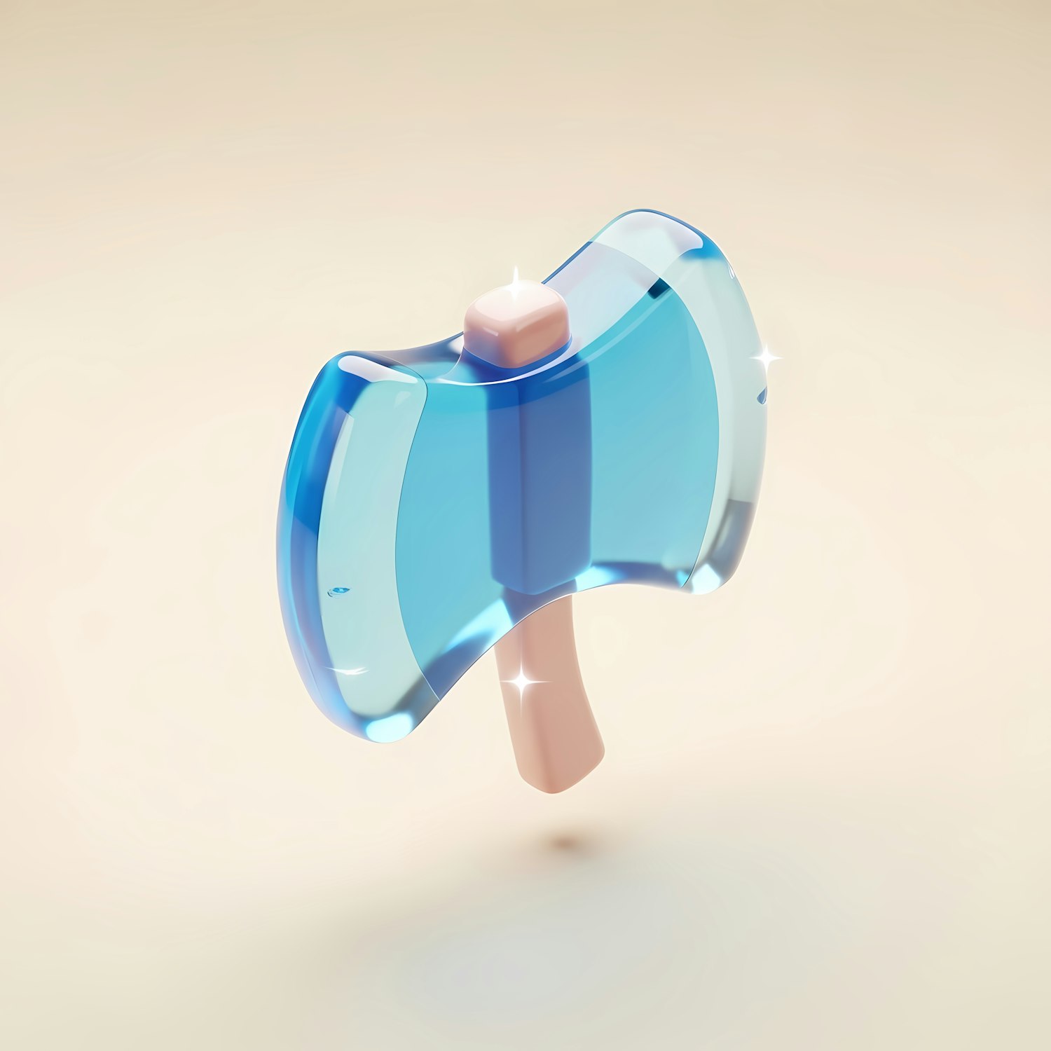 A sleek 3D-rendered translucent blue axe with a beige handle, floating against a soft beige background. Modern and minimalistic design.