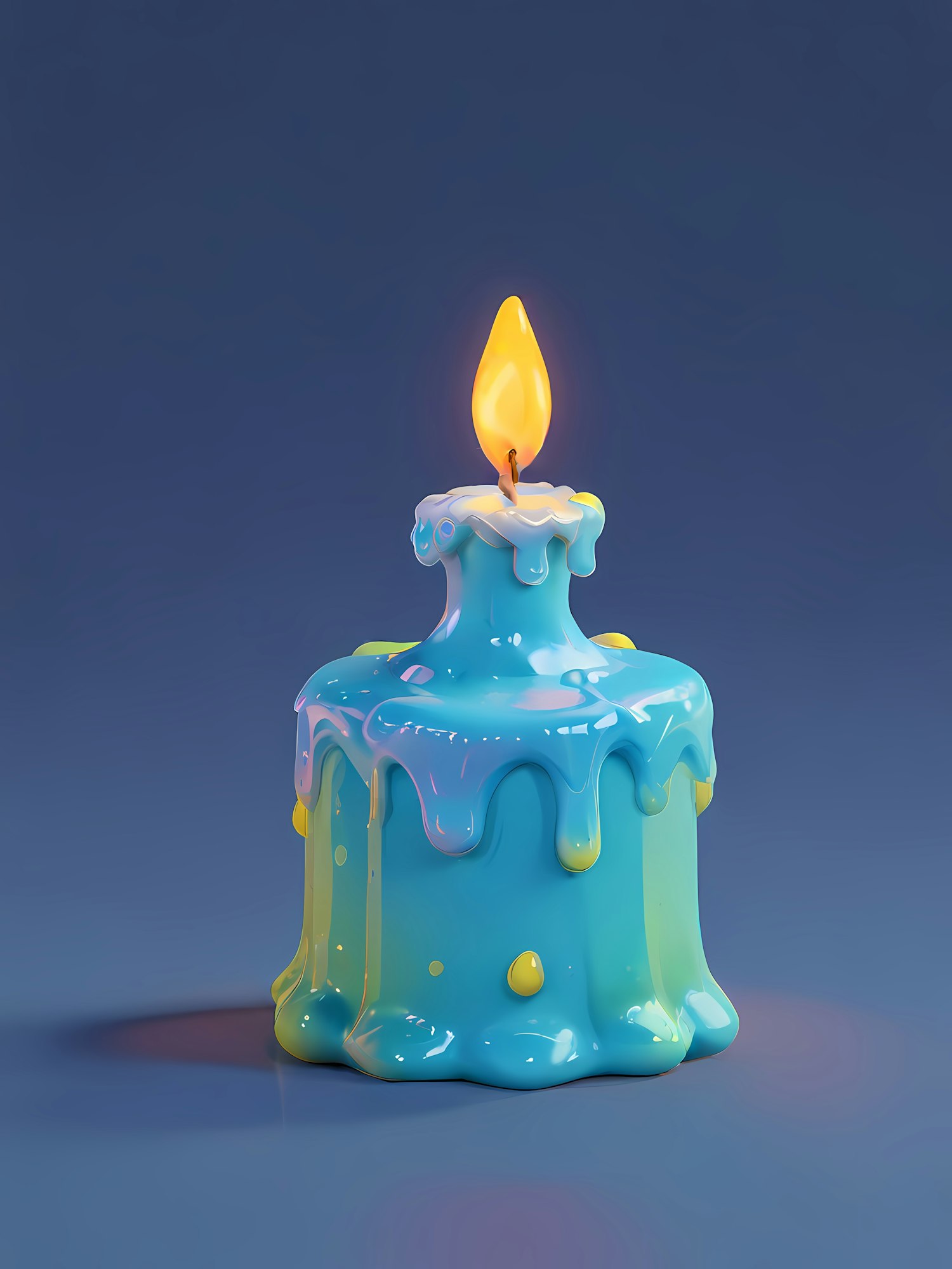 A glossy blue and yellow 3D candle with a melting design and glowing flame, set against a muted blue background.