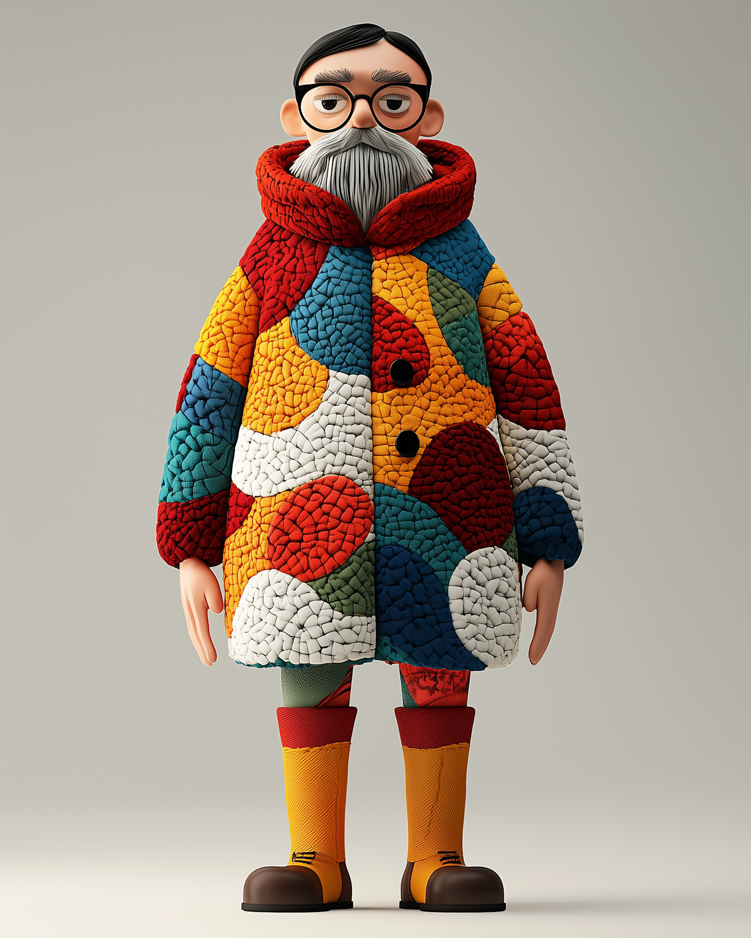 Stylized 3D character in a vibrant mosaic-patterned coat, yellow boots, and glasses, set against a neutral gray background.