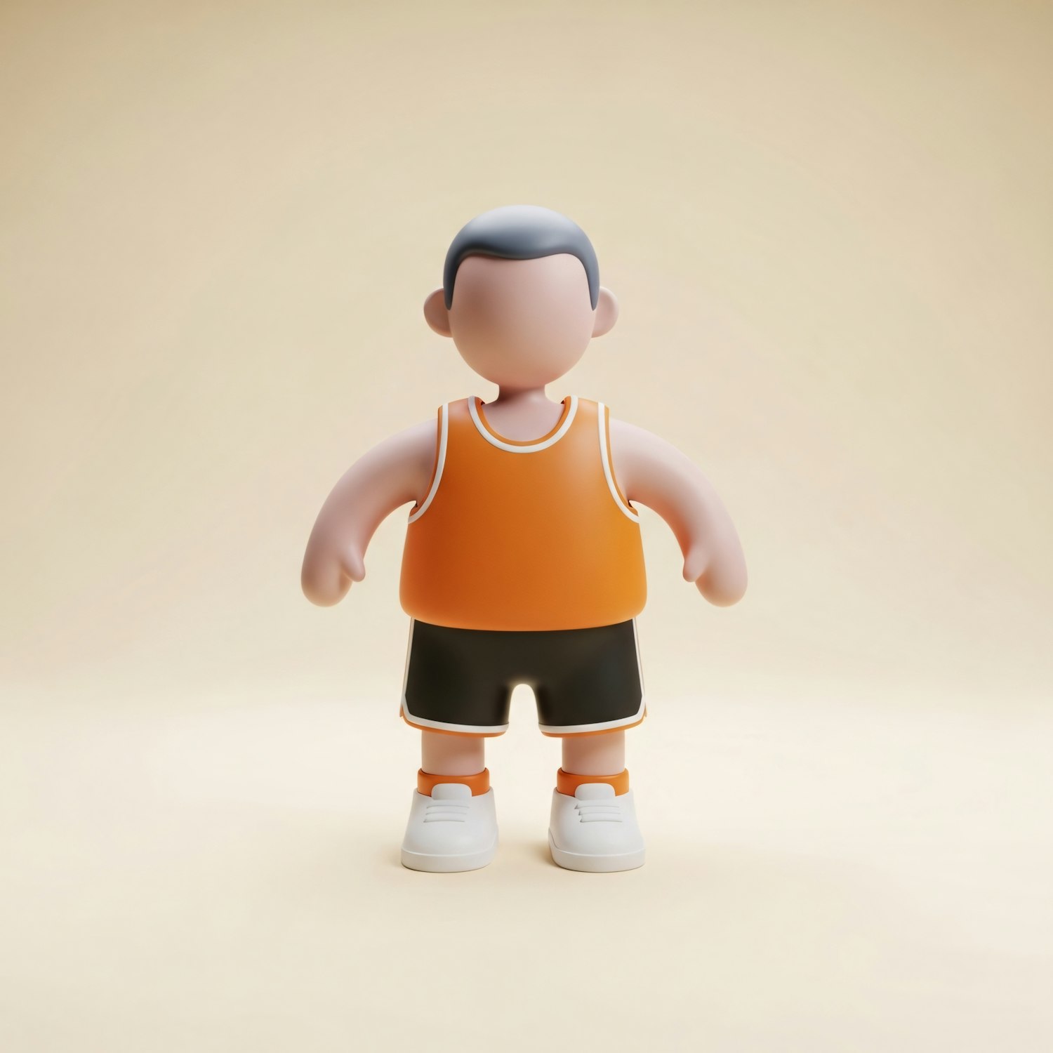 A 3D-rendered character in an orange tank top and black shorts stands against a beige background, showcasing a minimalist design.