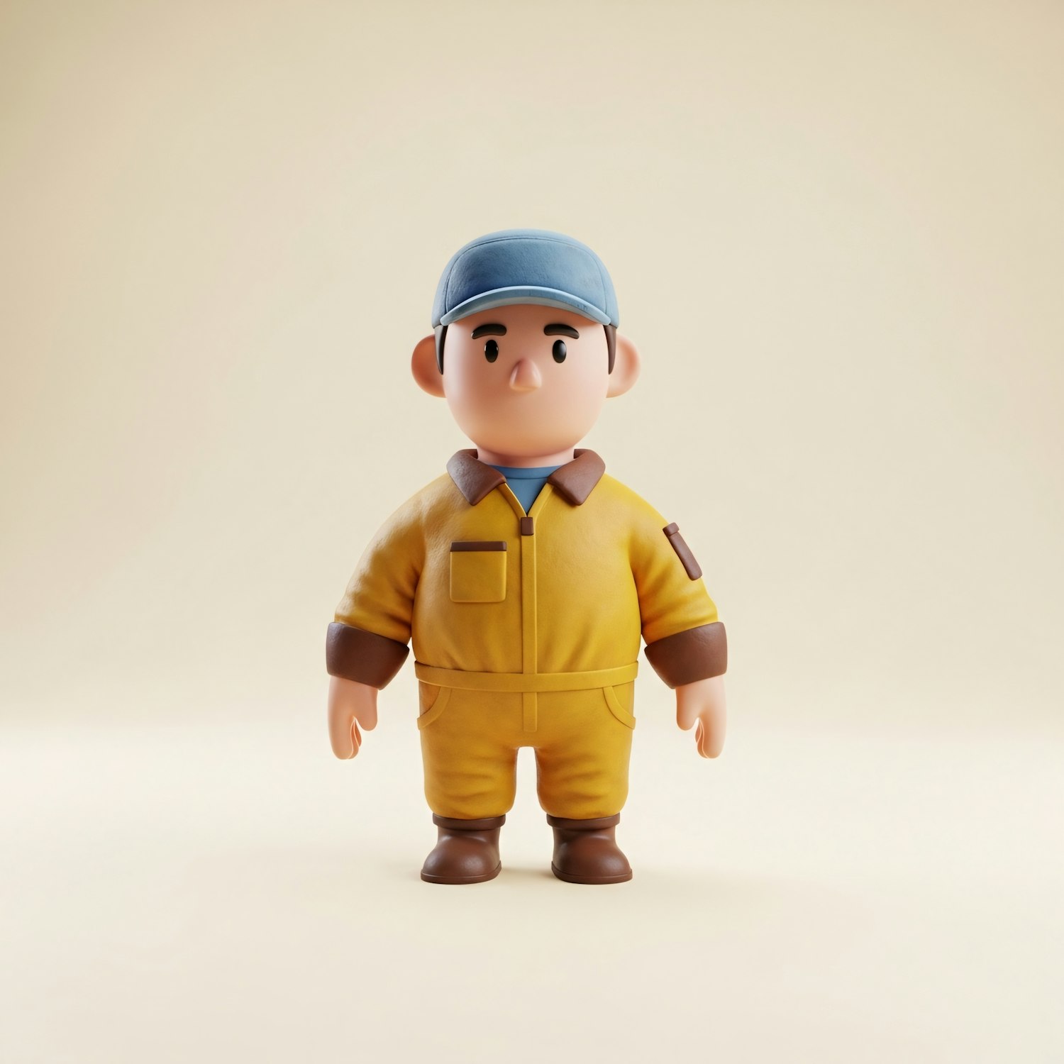 A 3D-rendered character in a yellow jumpsuit and blue cap, featuring a clean and minimalistic design against a neutral background.