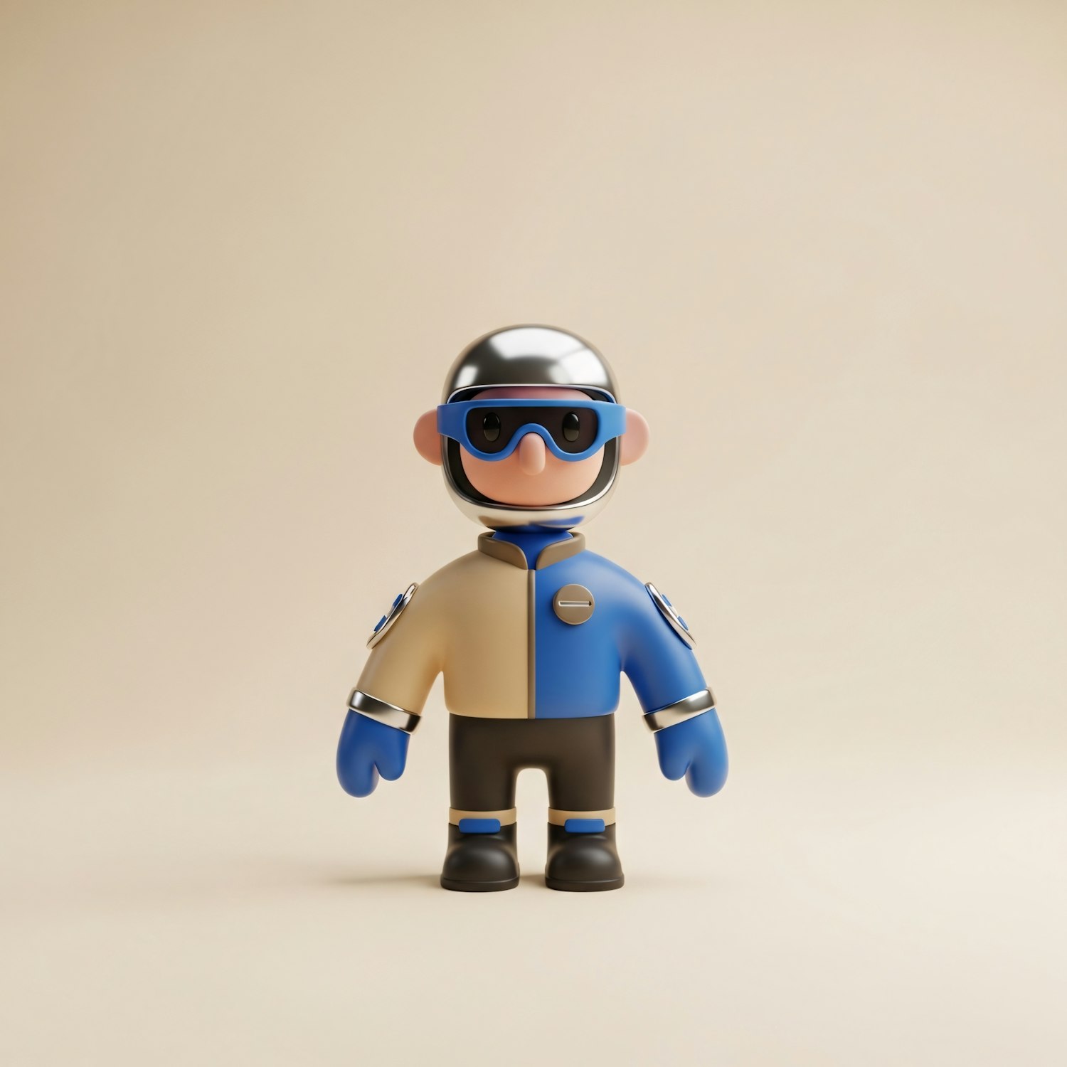 A 3D-rendered cartoon character in a two-toned outfit with a metallic helmet and goggles, set against a neutral background.