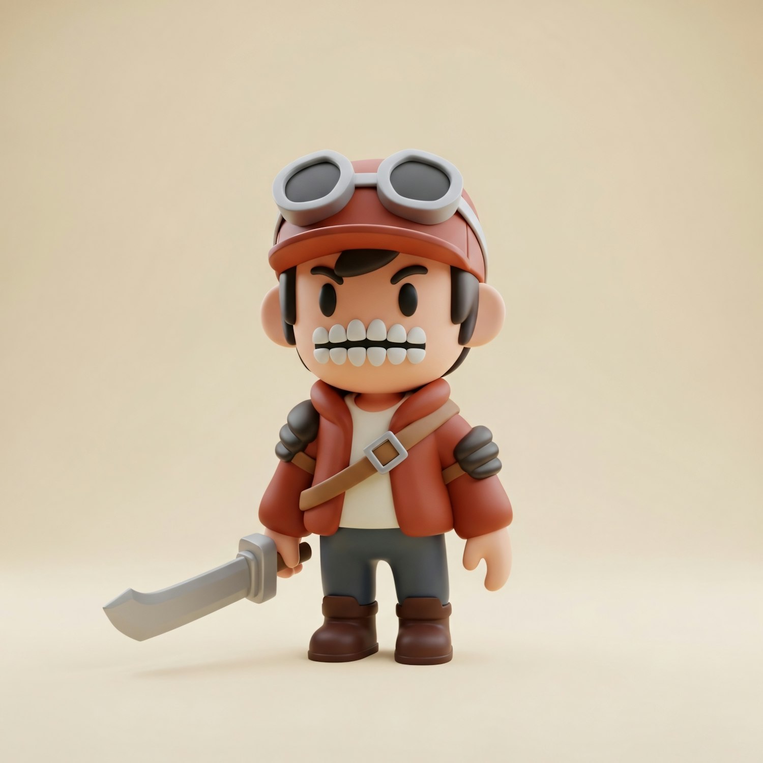 A 3D cartoon character with a red cap, goggles, and a sword, showcasing a playful and adventurous design against a neutral background.