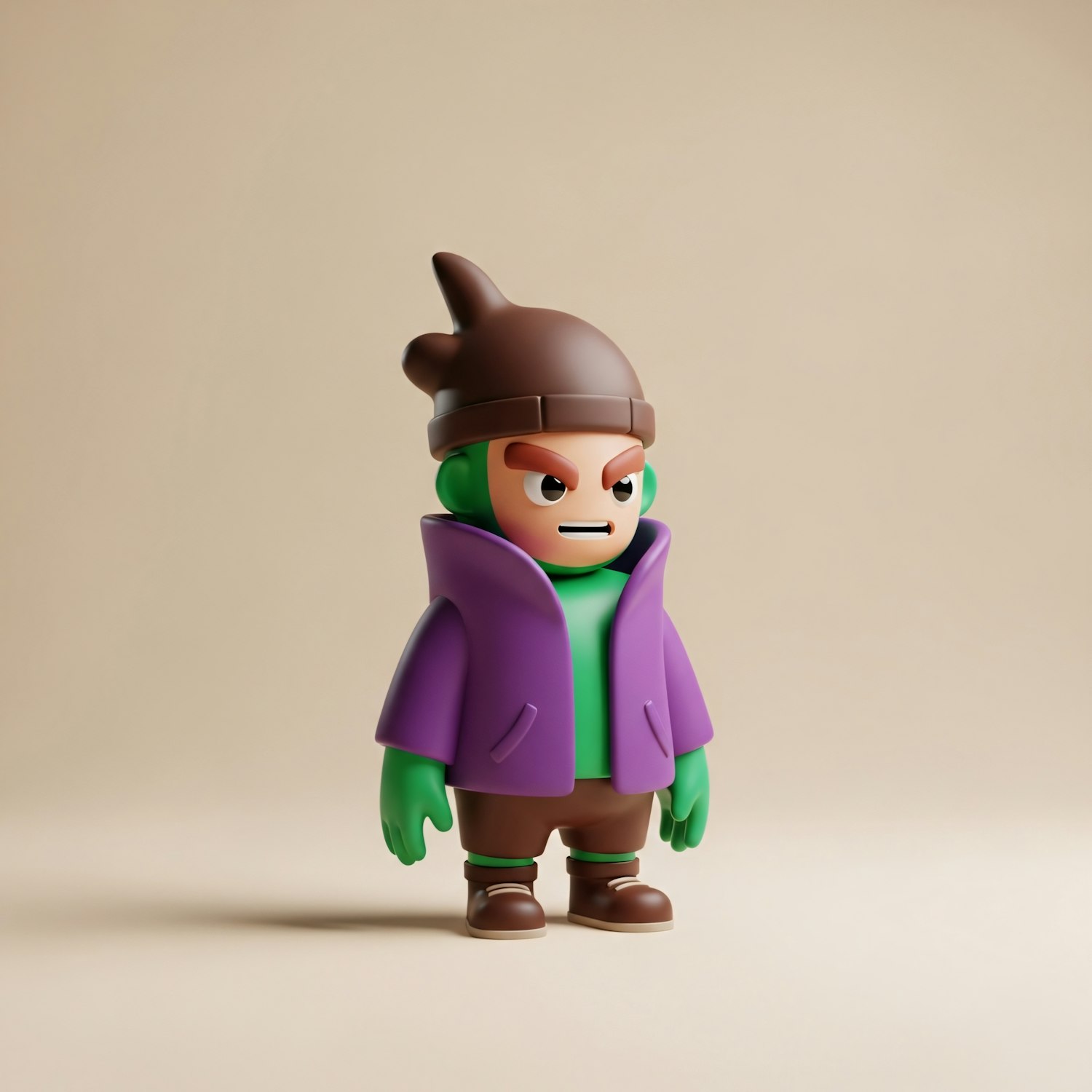 A vibrant 3D cartoon character with a green face, purple jacket, and brown hat, standing against a beige background.