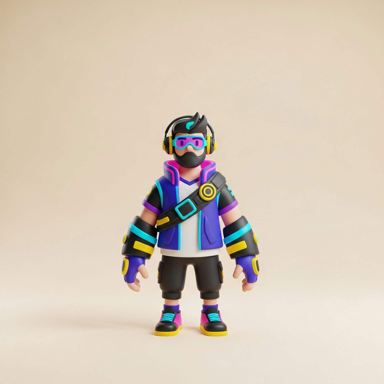 A vibrant 3D character with a tech-inspired outfit, featuring goggles, headphones, and a colorful jacket, standing against a neutral background.