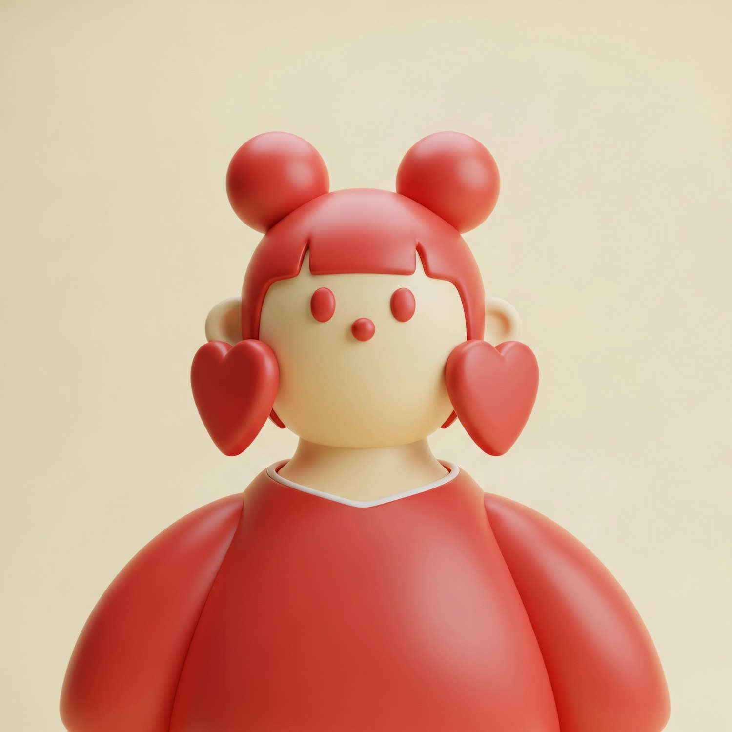 A cute 3D character with red hair buns and heart-shaped accessories, wearing a red outfit against a beige background.